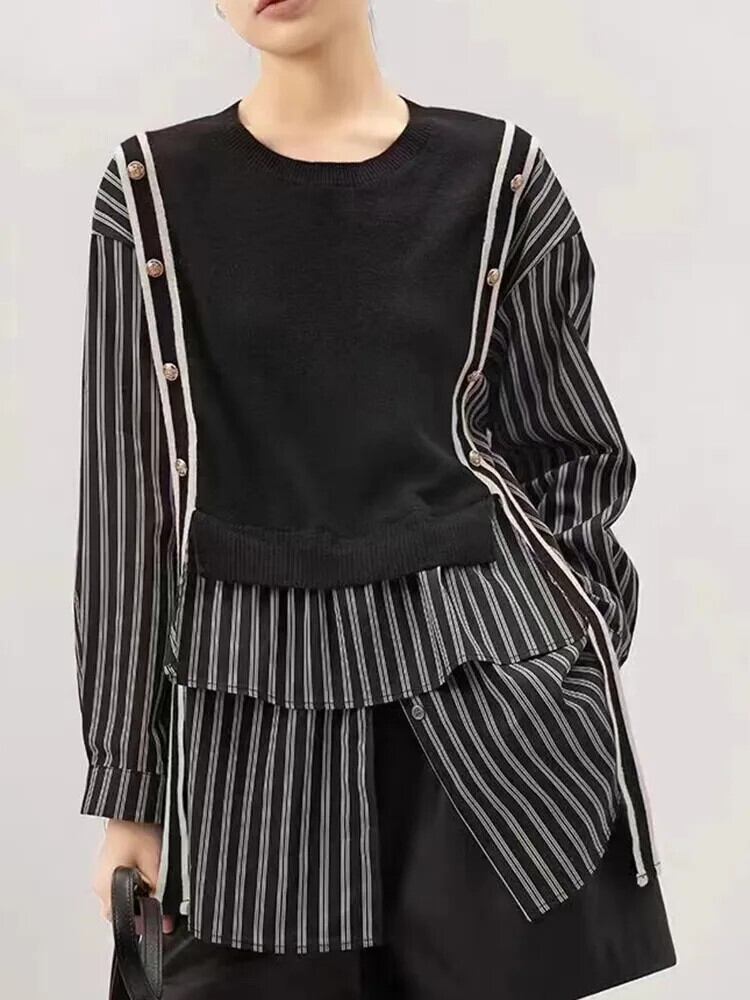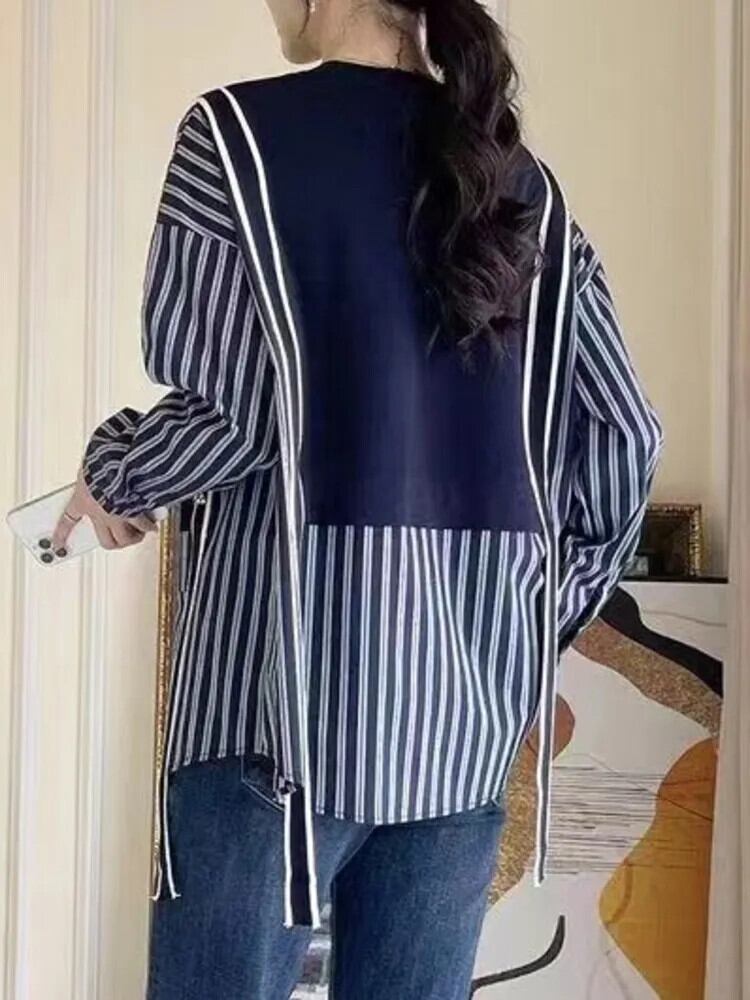 [EWQ] ストライプ フェイクツーピース パッチワーク シル レディース ゆったり 長袖 リボン結び 秋冬 16U4754 ロング オータム 秋物 ウィンター 冬物