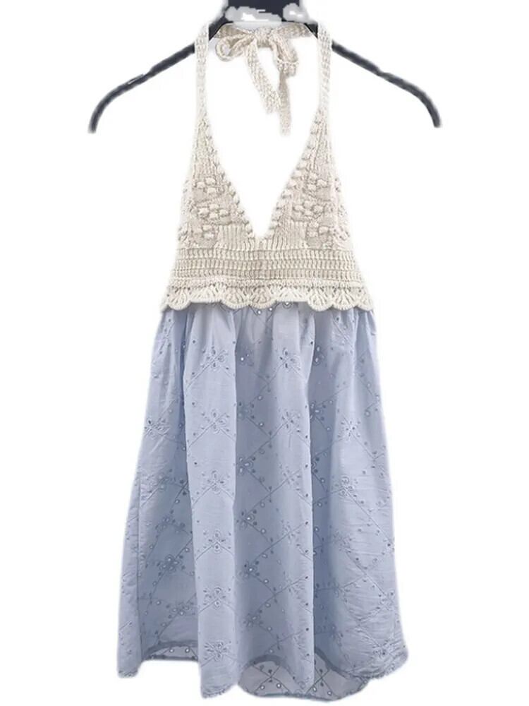 [EWQ] バックレス刺繍スプライスニットスリングドレスサマータイドビーチホリデーパッチワークドレス Vestido 16U4729 夏物