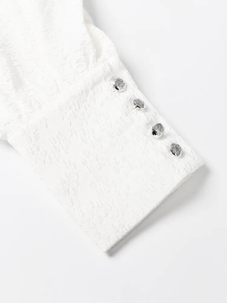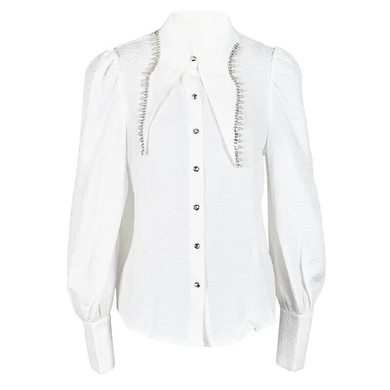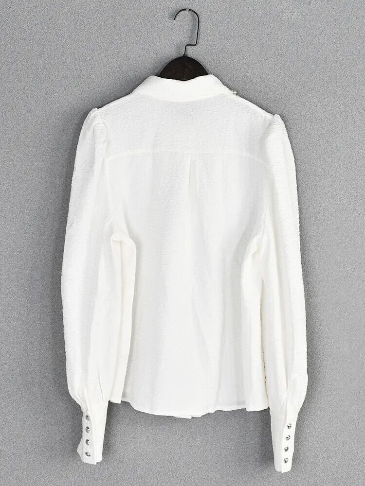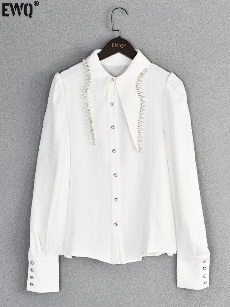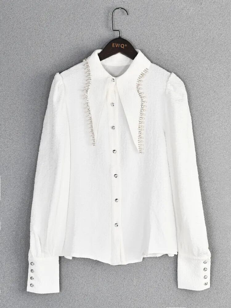 [EWQ] 白ジャガードシャツ長袖オフィスレディラペルパール装飾ブラウストップ春潮 16Y8729 ロング ホワイト スプリング 春物 真珠 会社 学校 通勤や通学にも