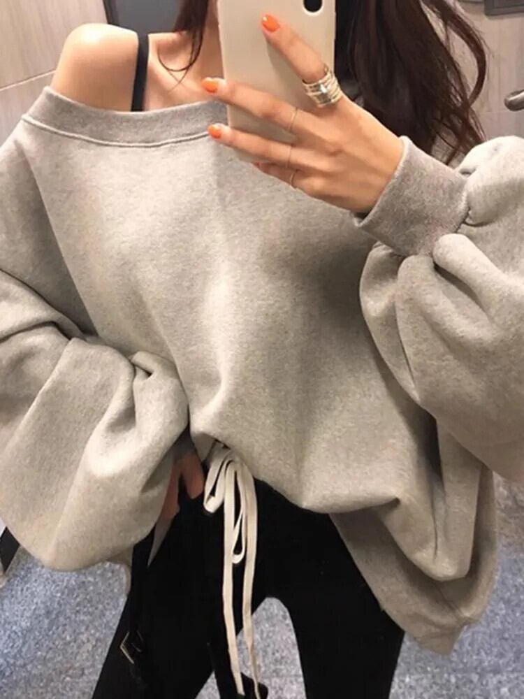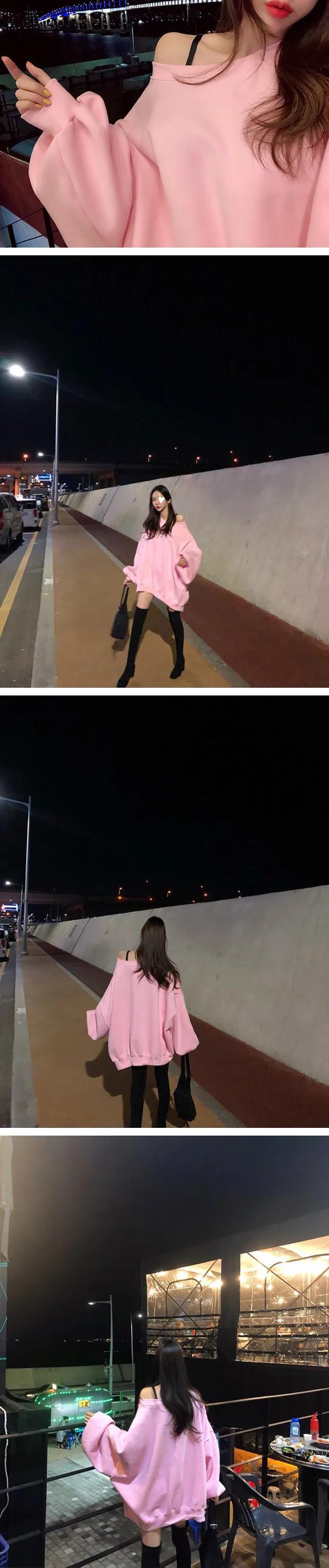 [EWQ] 不規則オフショルダースウェットぬいぐるみ肥厚ルーズ長袖プルオーバートップ秋冬 16U4927 ロング シャツ オータム 秋物 ウィンター 冬物