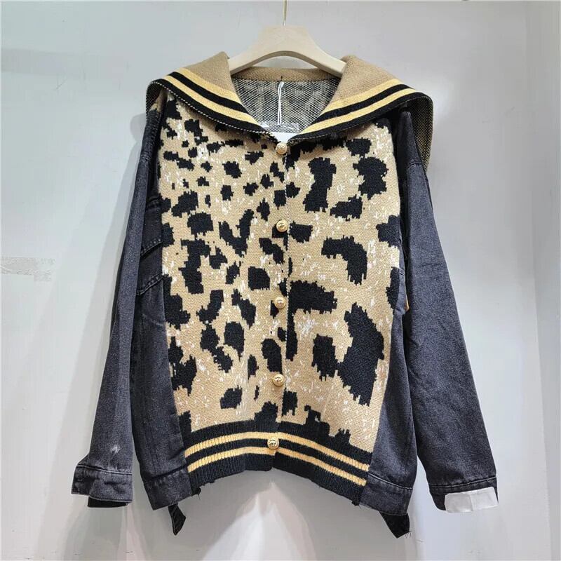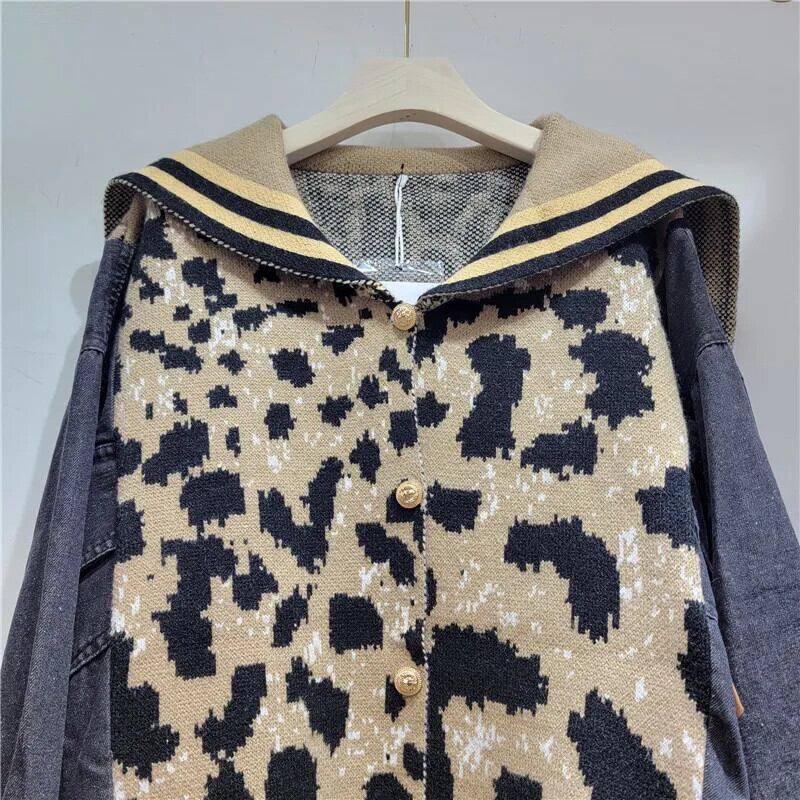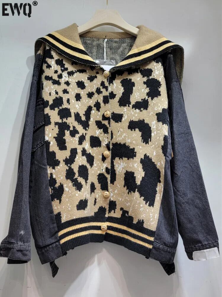 [EWQ] ヒョウ柄セータージャケット長袖デニムパッチワークコントラストカーディガンコート秋冬 16U4534 ロング オータム 秋物 ウィンター 冬物