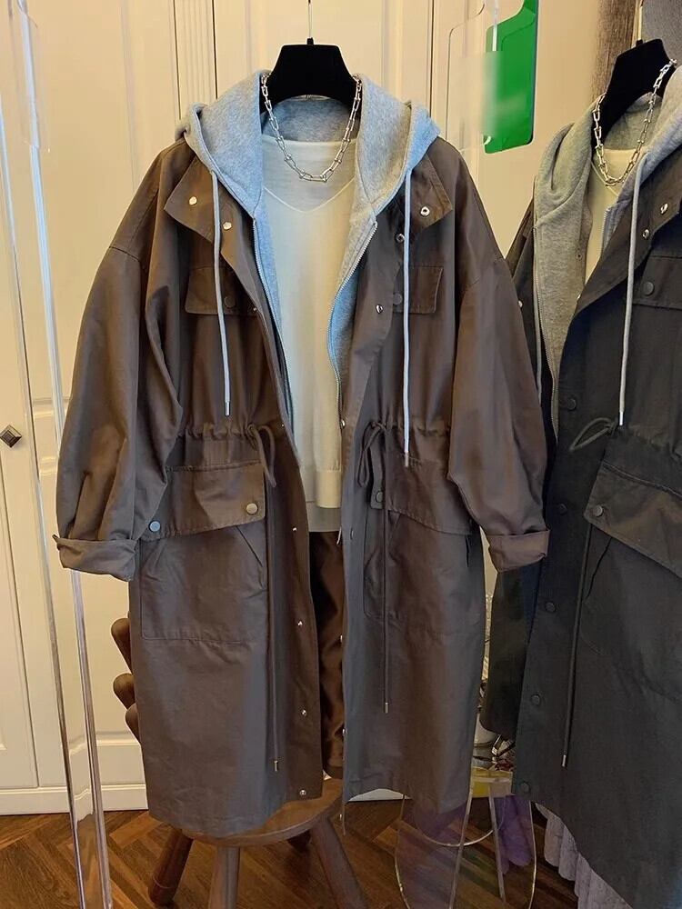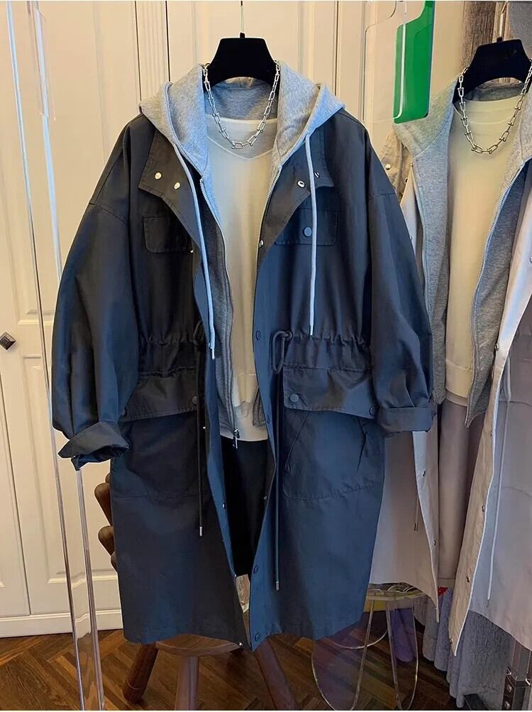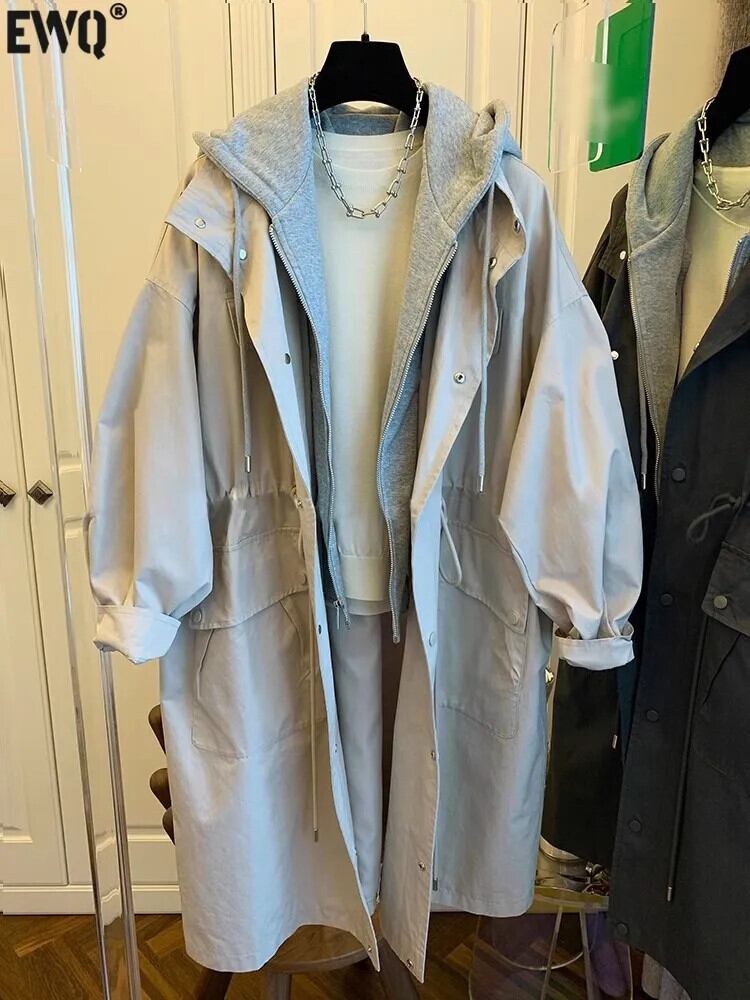 [EWQ] フード付き巾着ウインドブレーカーコートフェイク 2 ピースビッグサイズルーズトレンチジャケット秋冬 16U4260 オータム 秋物 ウィンター 冬物