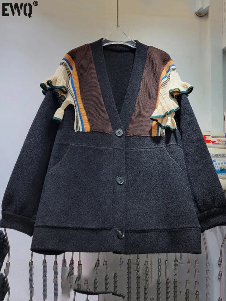 [EWQ] ファンガス パッチワーク ジャケット レディース V ネック シングルブレスト ルーズ ブラック ジャケット コート 秋冬 16U4674 オータム 秋物 ウィンター 冬物 Vネック