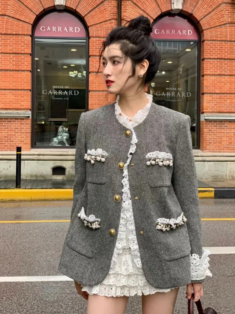 [EWQ] 複数ポケットパッチワークパールジャケット長袖レーススプライシングルーズコート秋冬複数ポケット ロング オータム 秋物 ウィンター 冬物 真珠