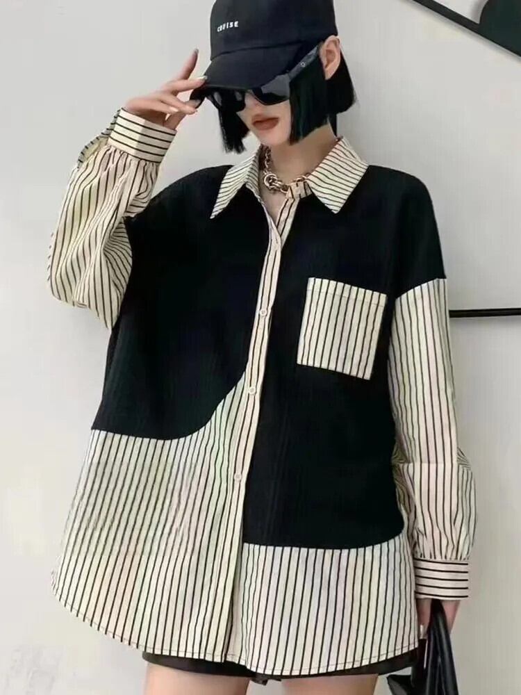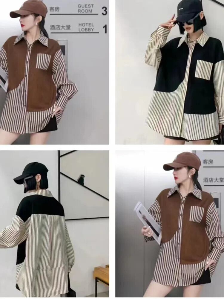 [EWQ] フェイクツーピースストライプコントラストシャツ長袖シングルブレストルーズトップ秋冬 16U4751 ロング オータム 秋物 ウィンター 冬物