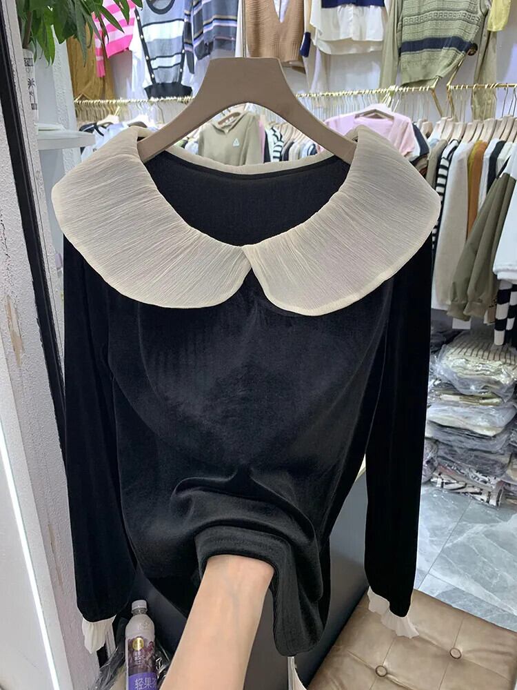 [EWQ] セーラー襟フリルパッチワークシャツ レディース ゆったり 長袖 トップス 秋冬 16U4516 ロング オータム 秋物 ウィンター 冬物