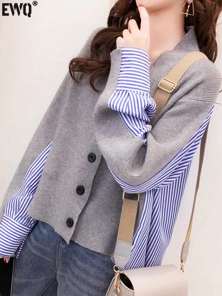 [EWQ] ビッグサイズ長袖ストライプシャツカーディガンコートシングルブレストセータージャケット秋冬 16U3764 ロング オータム 秋物 ウィンター 冬物