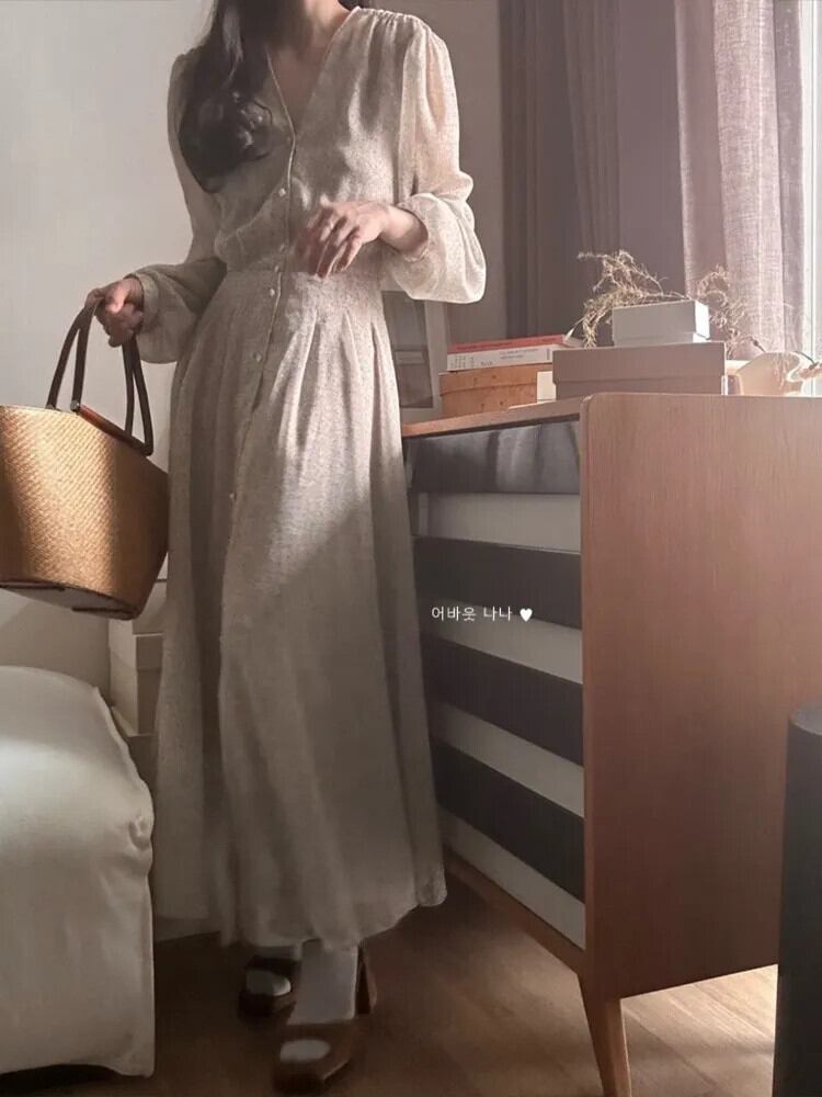 [EWQ] プリント弾性ウエストドレス長袖シングルブレストルーズドレス Vestido 秋冬 16U4087 ロング エラスティック 伸縮 オータム 秋物 ウィンター 冬物