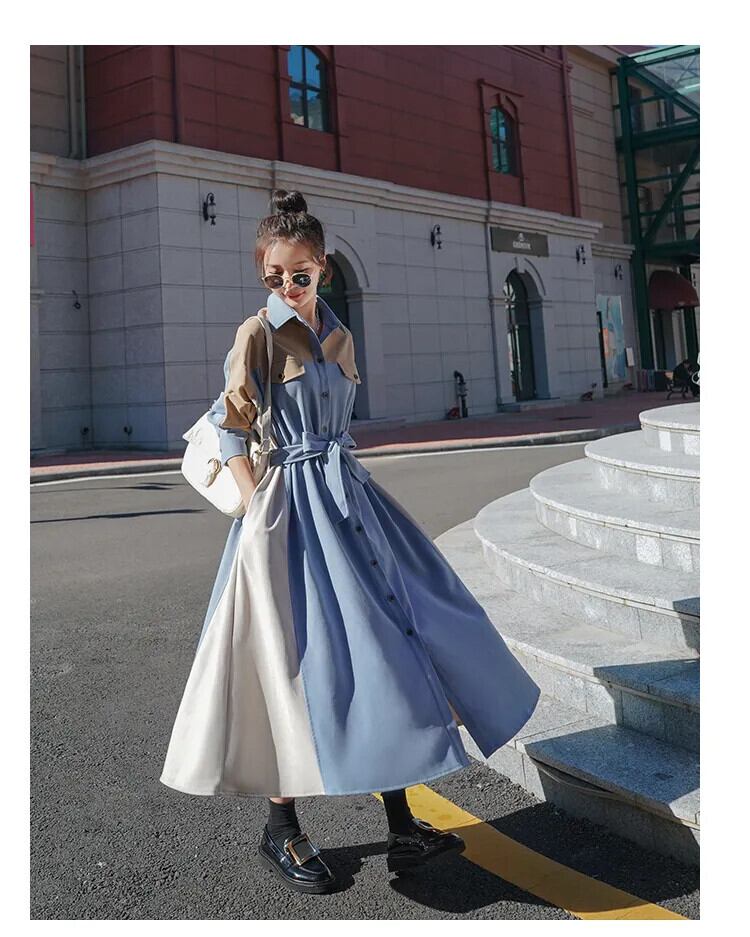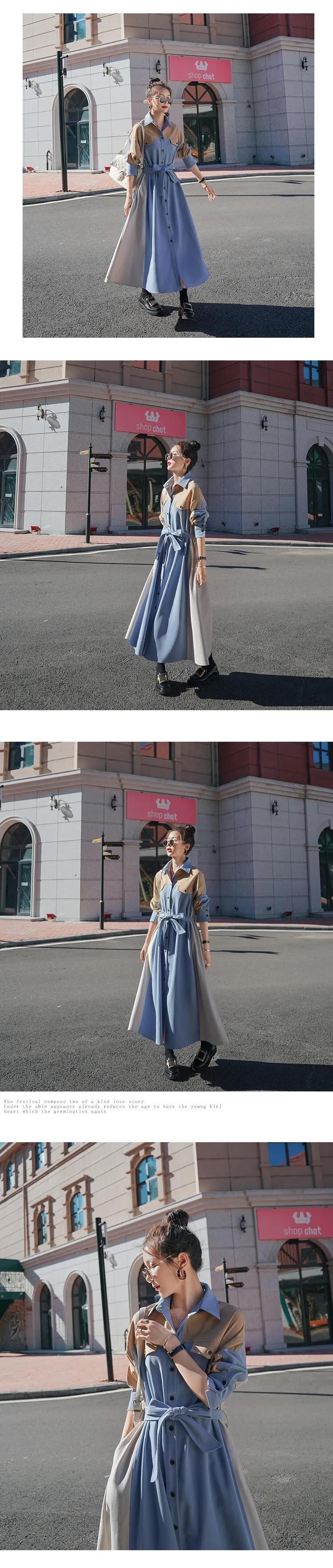 [EWQ] コントラストパッチワークレースアップドレス長袖シングルブレストドレス Vestido 秋冬 16U4923 ロング オータム 秋物 ウィンター 冬物