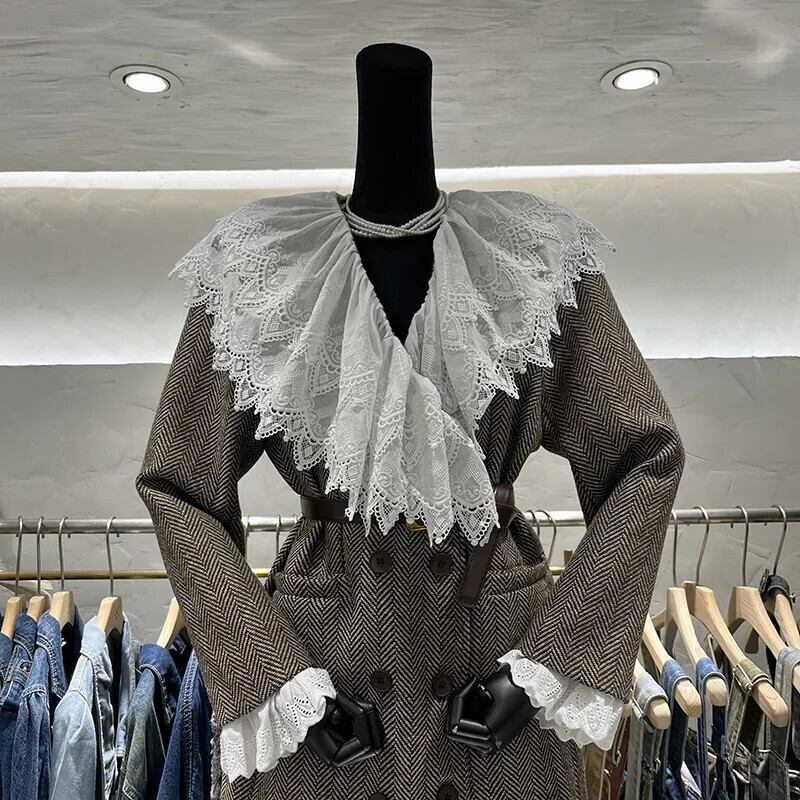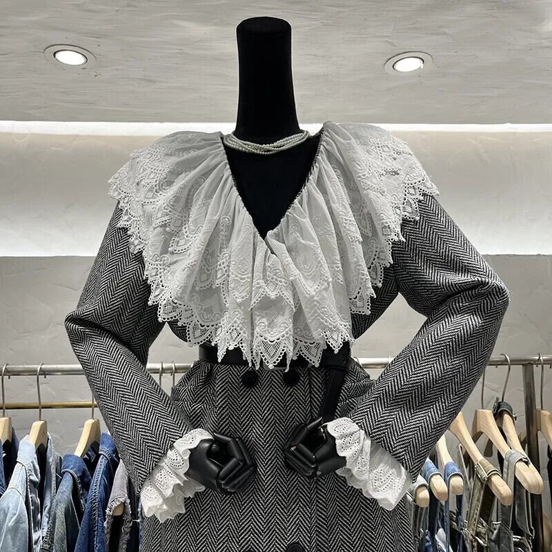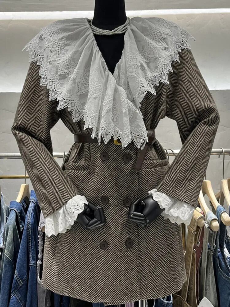 [EWQ] ベルト付きウールブレザーコートチェック柄レースパッチワークネック長袖スーツジャケット秋冬 6U4937 ロング オータム 秋物 ウィンター 冬物 ハーネス