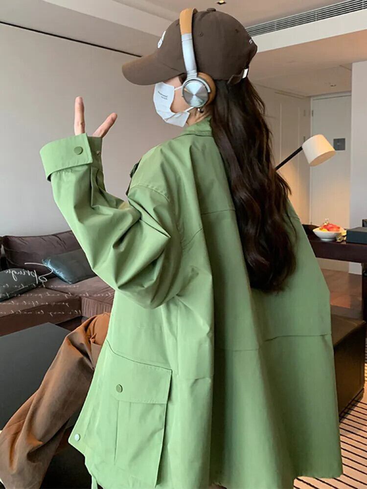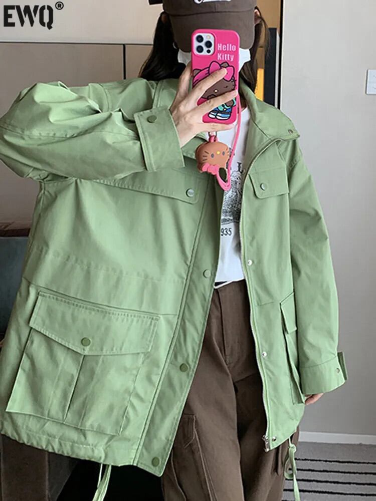 [EWQ] グリーンスタンドくるみボタンジャケット長袖ビッグポケットスプライシングルーズジャケットコート秋冬 16U4290 ロング レッド オータム 秋物 ウィンター 冬物