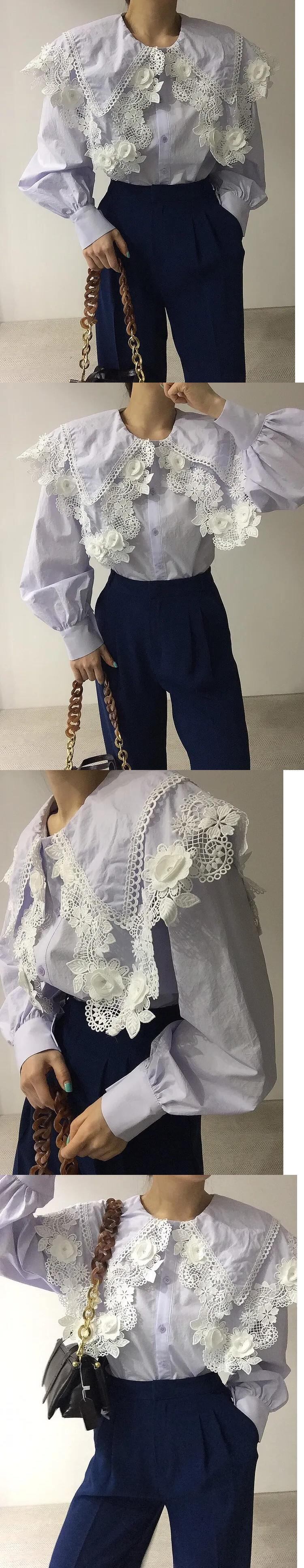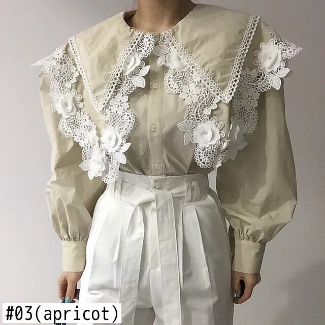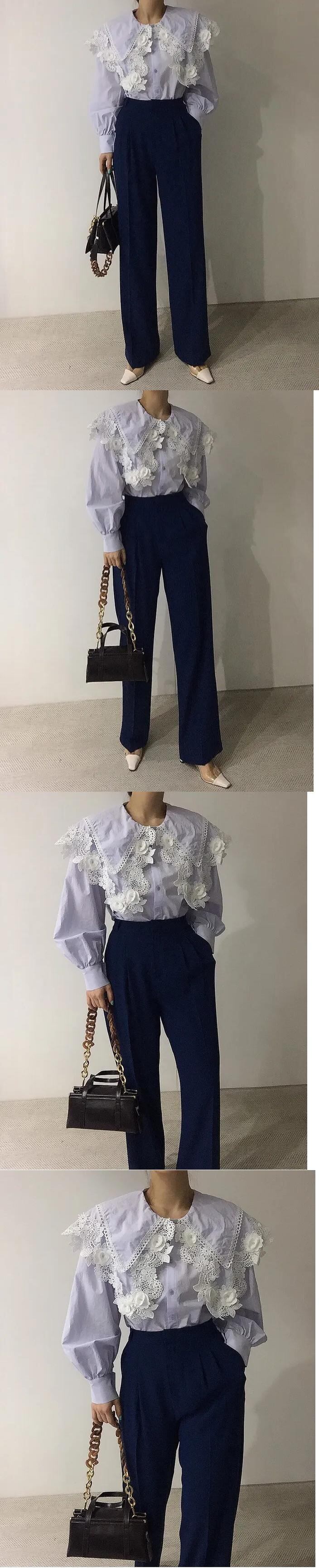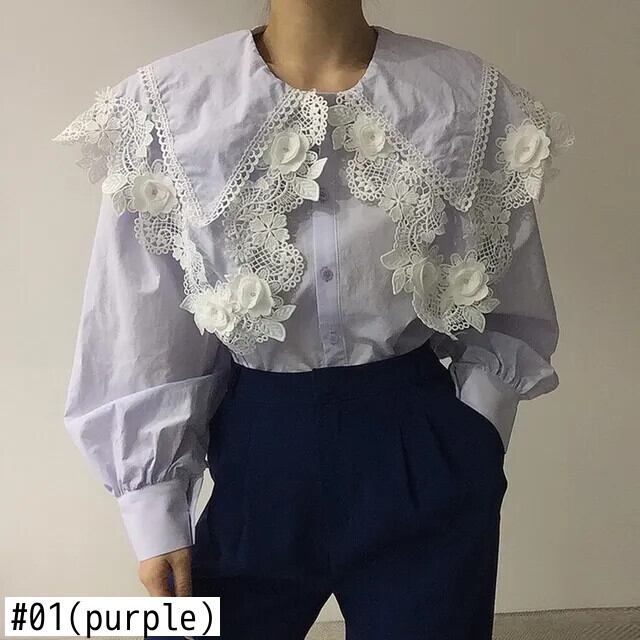 [EWQ] ダブルピーターパンカラーシャツランタンスリーブルーズフックフラワー秋潮トップス オータム 秋物 フラワーデザイン