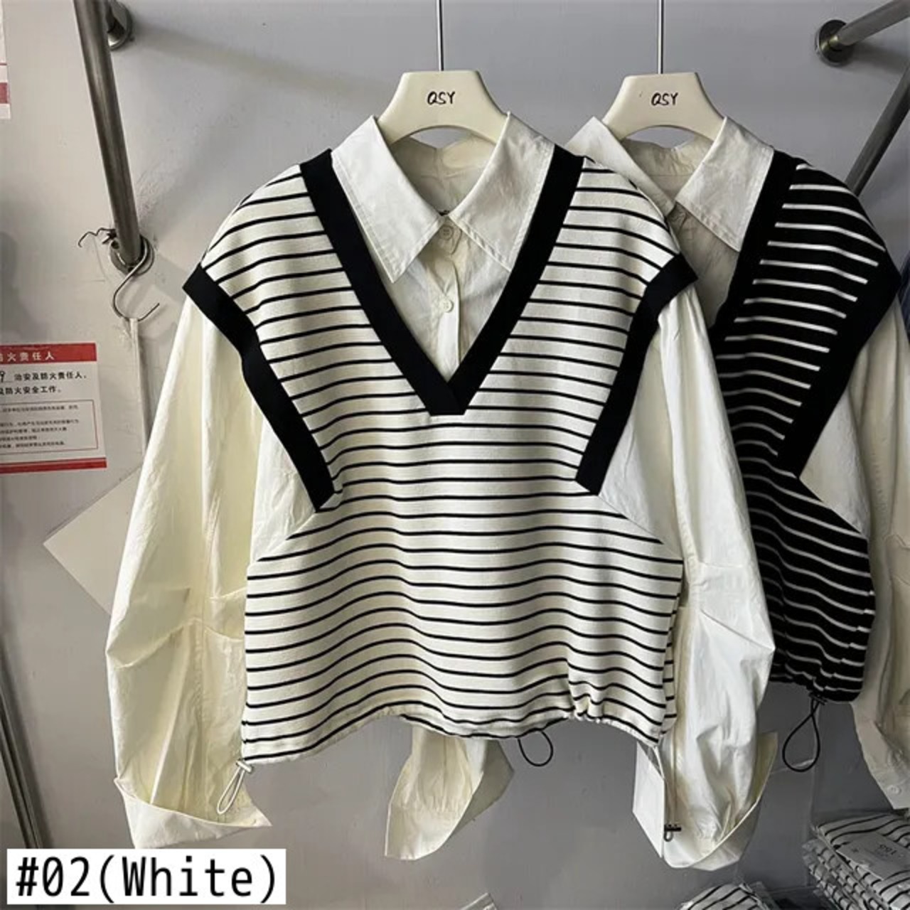 [EWQ] ストライプ ルーズ シャツ レディース 裾巾着 長袖 フェイク ツーピース 秋冬 トップス 16U4835 ロング オータム 秋物 ウィンター 冬物