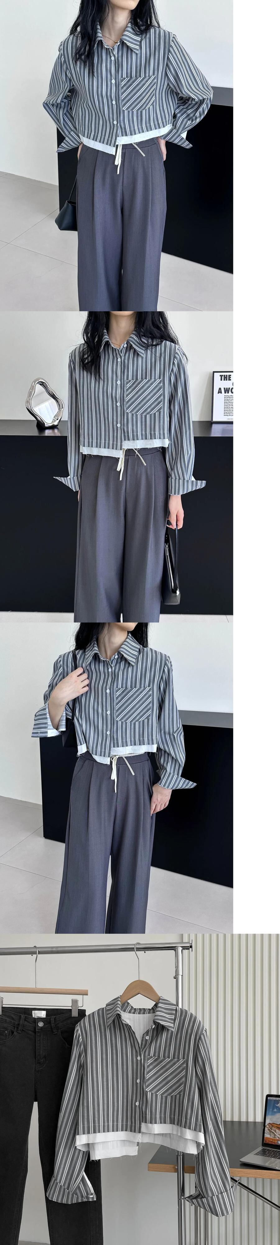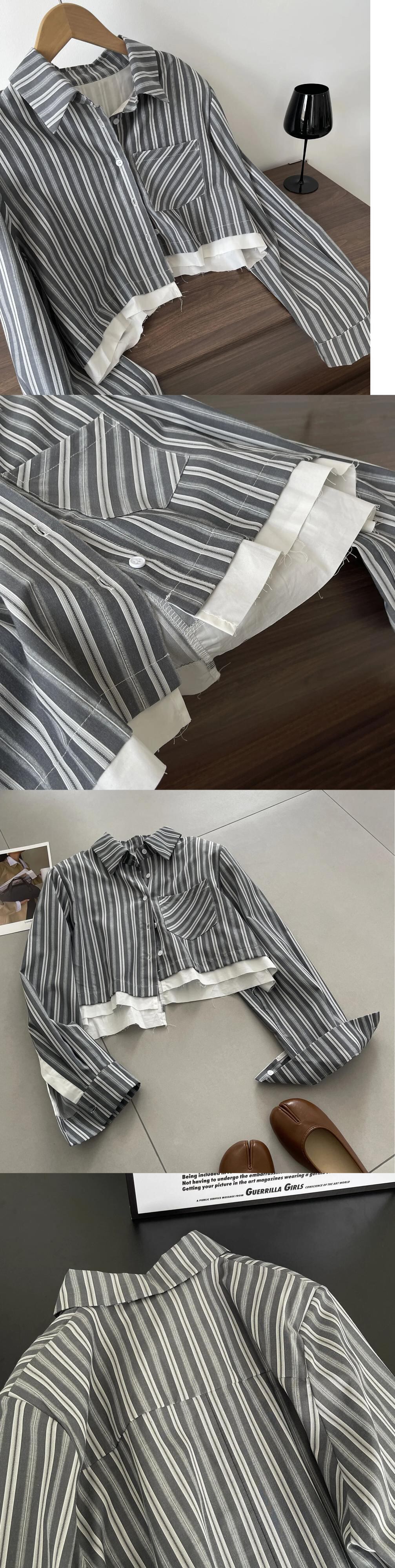 [EWQ] ストライプ ゲイリー ルーズ シャツ レディース シングルブレスト イレギュラー パッチワーク トップス 秋冬 16U4793 オータム 秋物 ウィンター 冬物