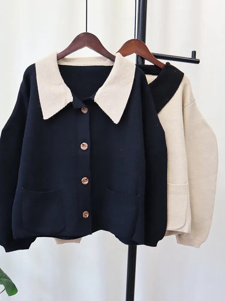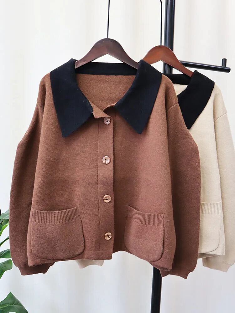 [EWQ] 秋レトロラペルコントラストカラーシングルブレストルーズセーターカーディガン長袖ニットコート ロング オータム 秋物