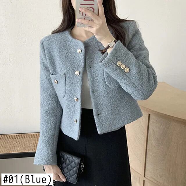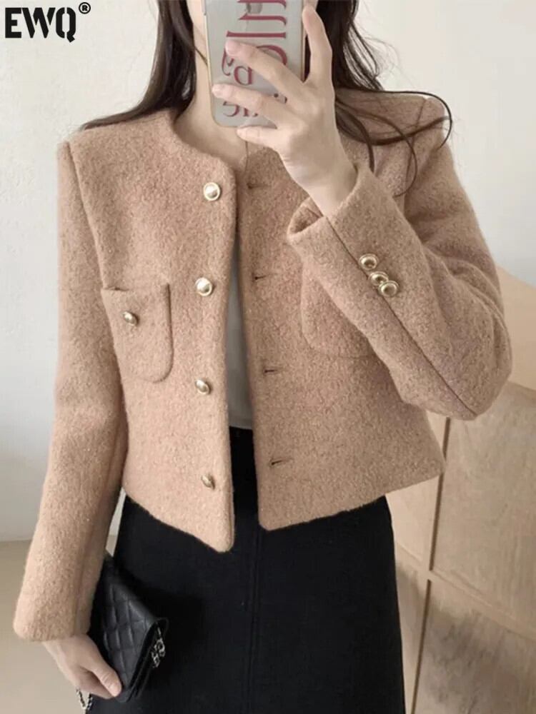 [EWQ] 甘いウールジャケットシングルブレストダブルポケットパッチワークショートジャケット厚手コート秋冬 16U4229 大人ガーリー スウィート キュート カジュアル オータム 秋物 ウィンター 冬物