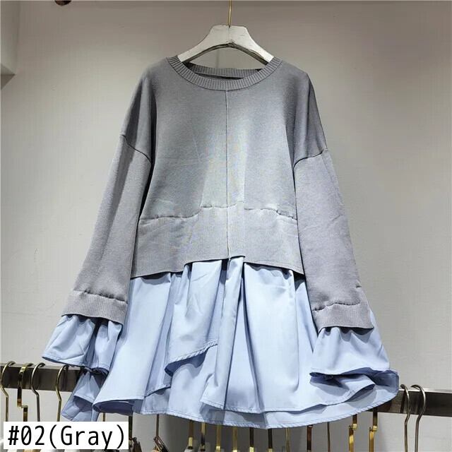 [EWQ] フェイクツーピースパッチワークニットトレーナー長袖フリルスプライスプルオーバートップ秋冬 16U4464 ロング オータム 秋物 ウィンター 冬物