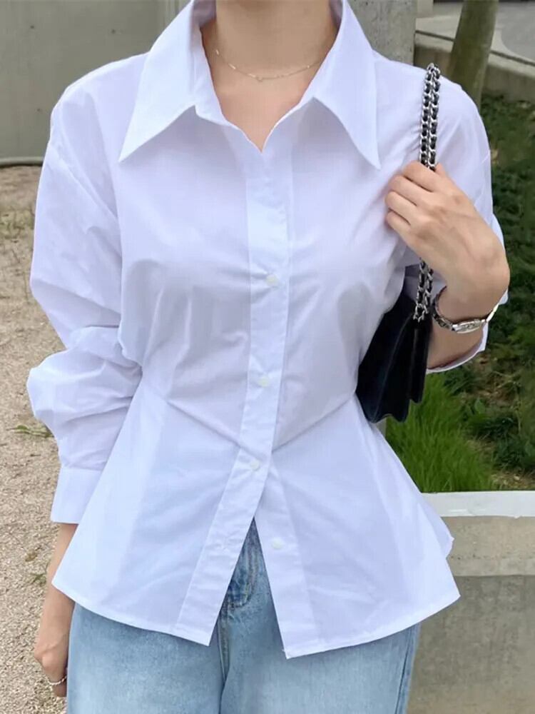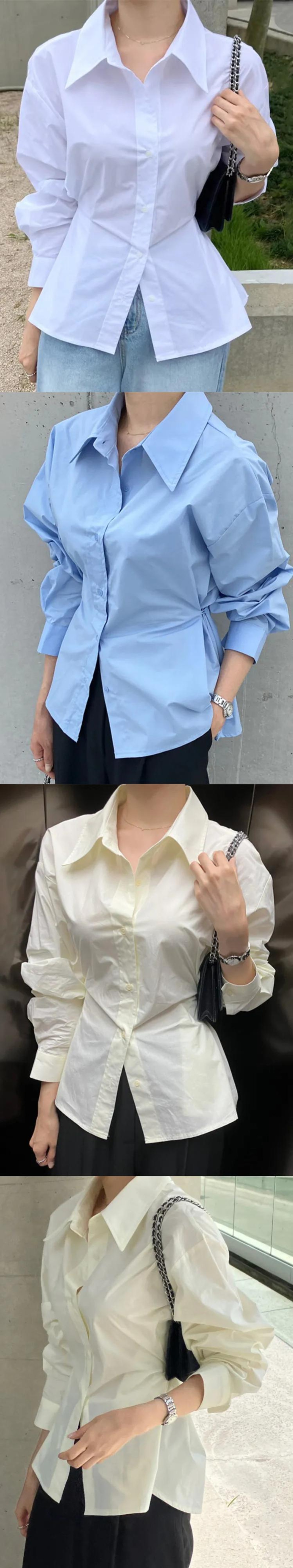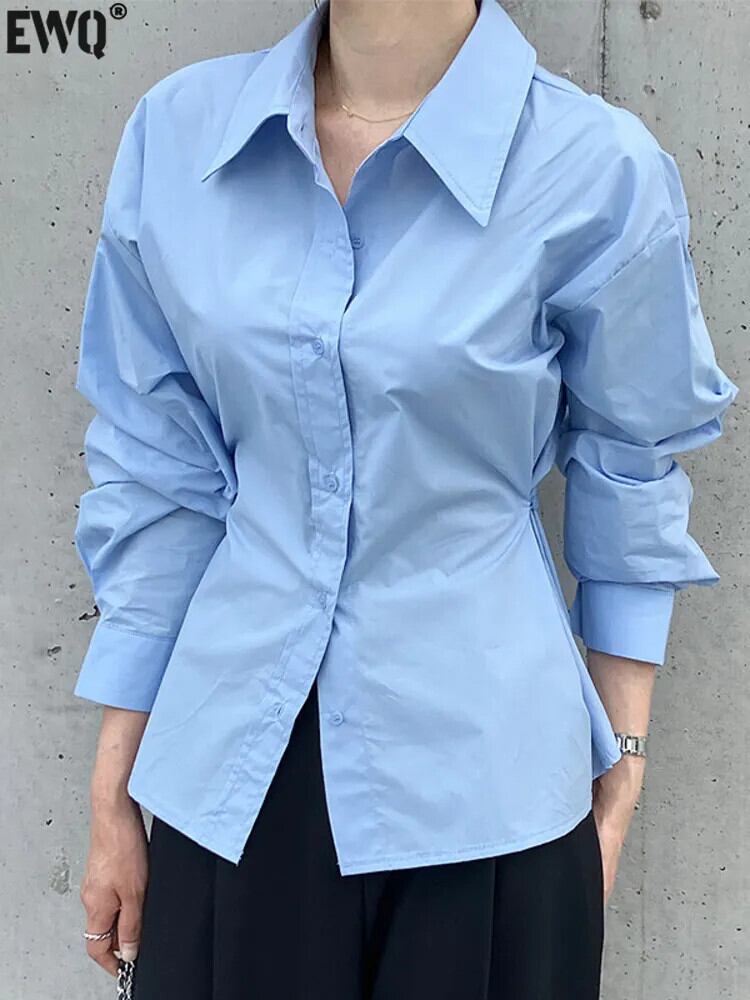 [EWQ] ブルーシャツ長袖シングルブレストオフィスレディトップス秋冬潮 16U4303 ロング オータム 秋物 ウィンター 冬物 会社 学校 通勤や通学にも