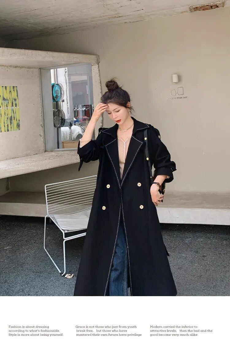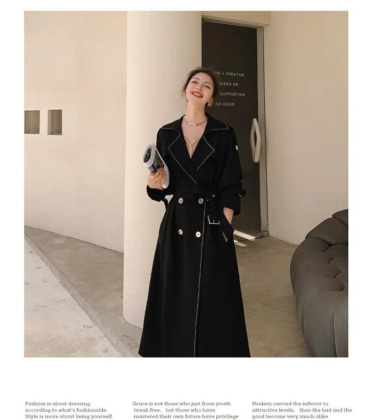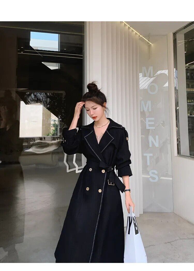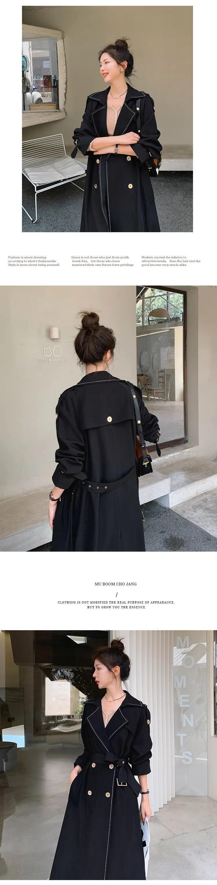 [EWQ] ブライトライン装飾ウインドブレーカーコートウエストバンド付き秋冬潮ダブルブレストトレンチ 16U4916 オータム 秋物 ウィンター 冬物