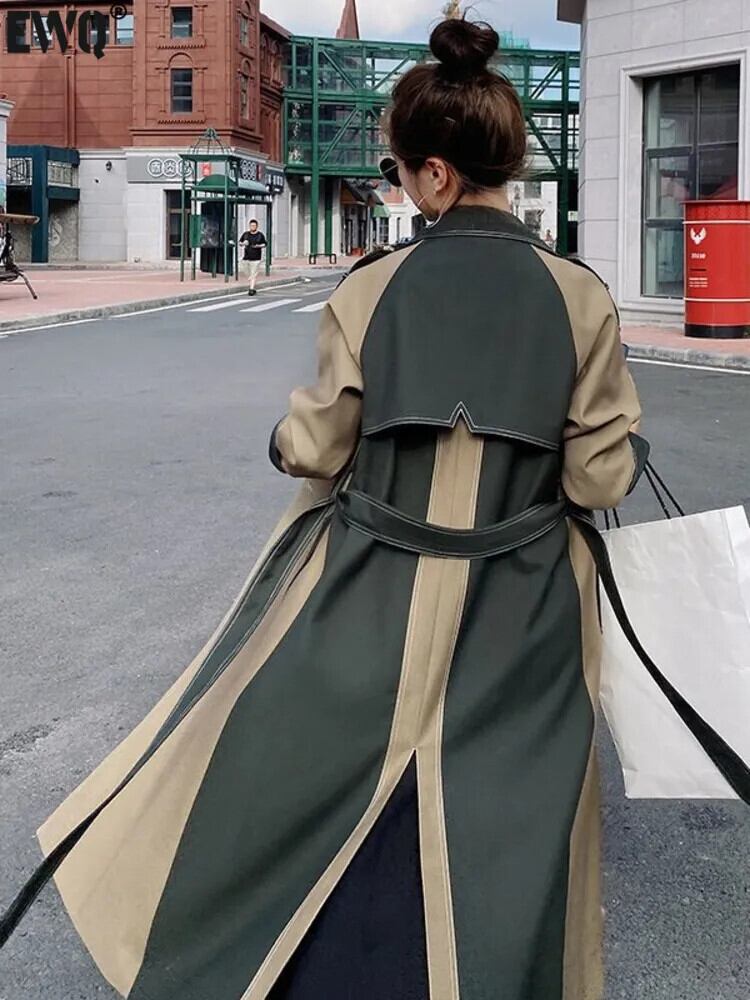 [EWQ] パッチワーク ベルト付き ウインドブレーカー コート レディース 長袖 ルーズ 2つボタン トレンチ 秋冬 16U4289 ロング オータム 秋物 ウィンター 冬物 ハーネス
