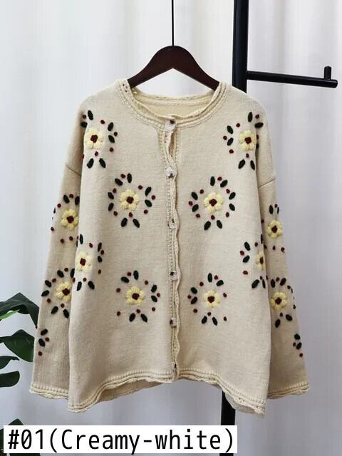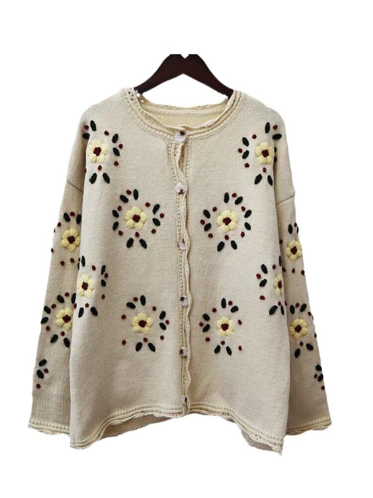 [EWQ] 秋レトロ刺繍花柄 O ネックルーズセーターカーディガンシングルブレストニットコート オータム 秋物 Oネック
