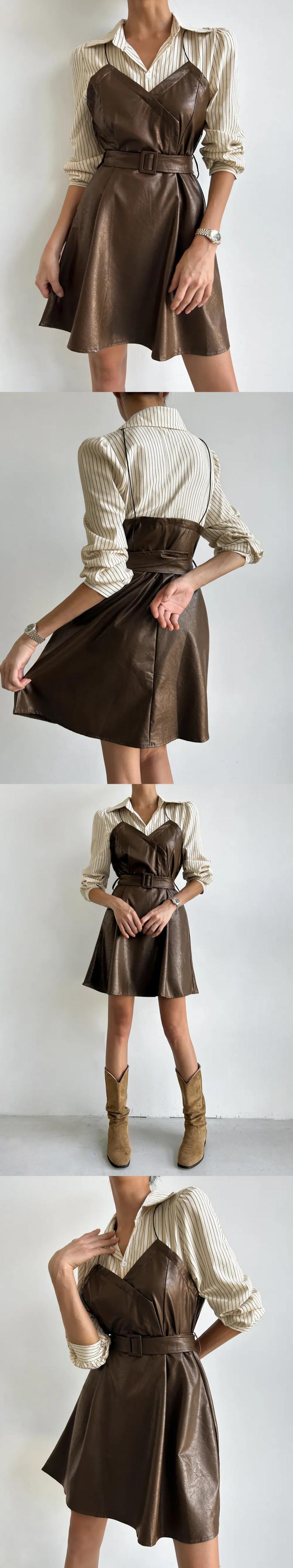 [EWQ] フェイクツーピースパッチワークシャツドレスベルト付き Pu レザーショートドレス秋冬潮 16U5225 オータム 秋物 ウィンター 冬物 ハーネス