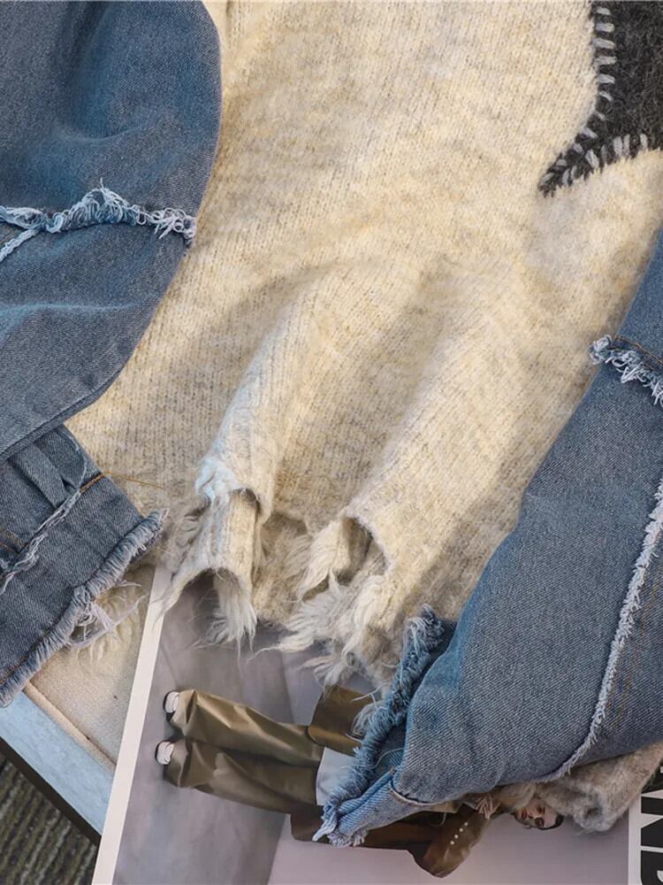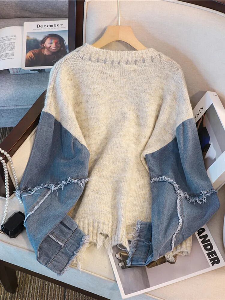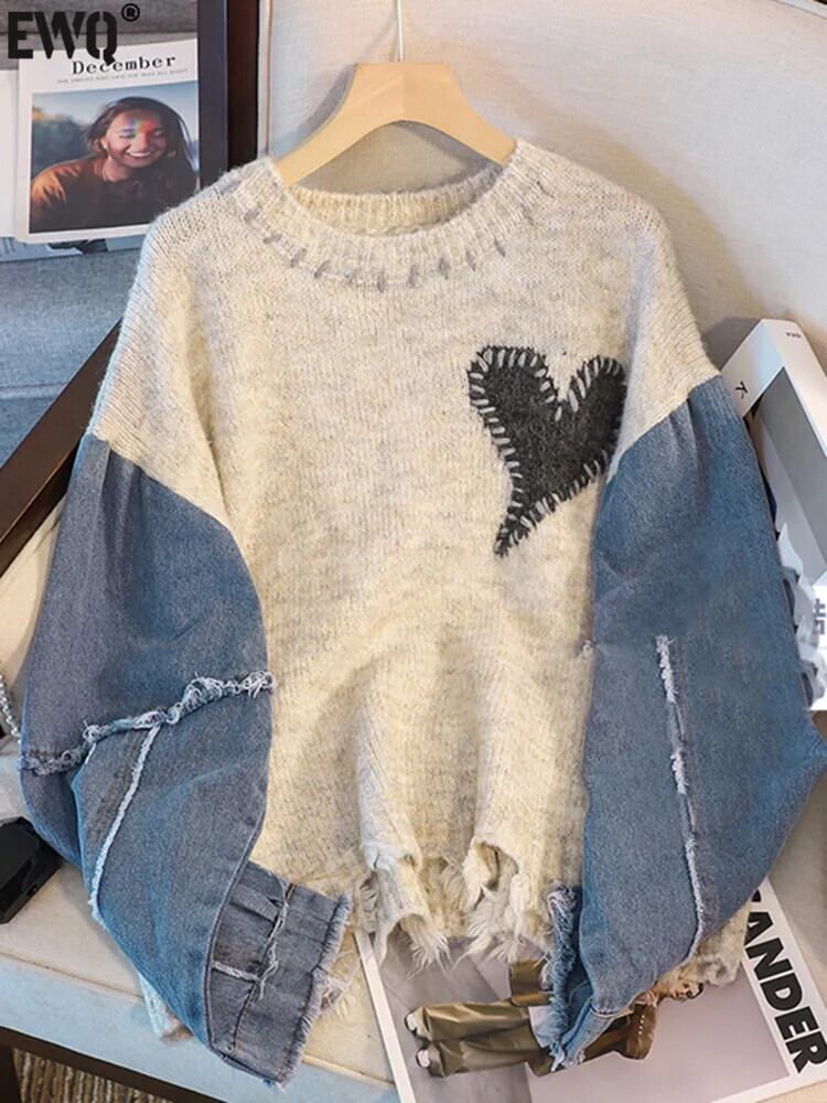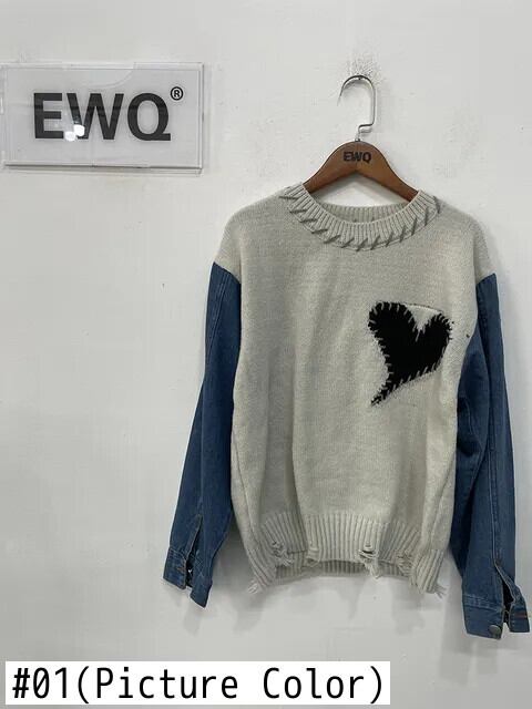 [EWQ] ラブ刺繍コントラストセーター裾カットアウトテル長袖パッチワークプルオーバーニット秋冬 16U4772 ロング オータム 秋物 ウィンター 冬物