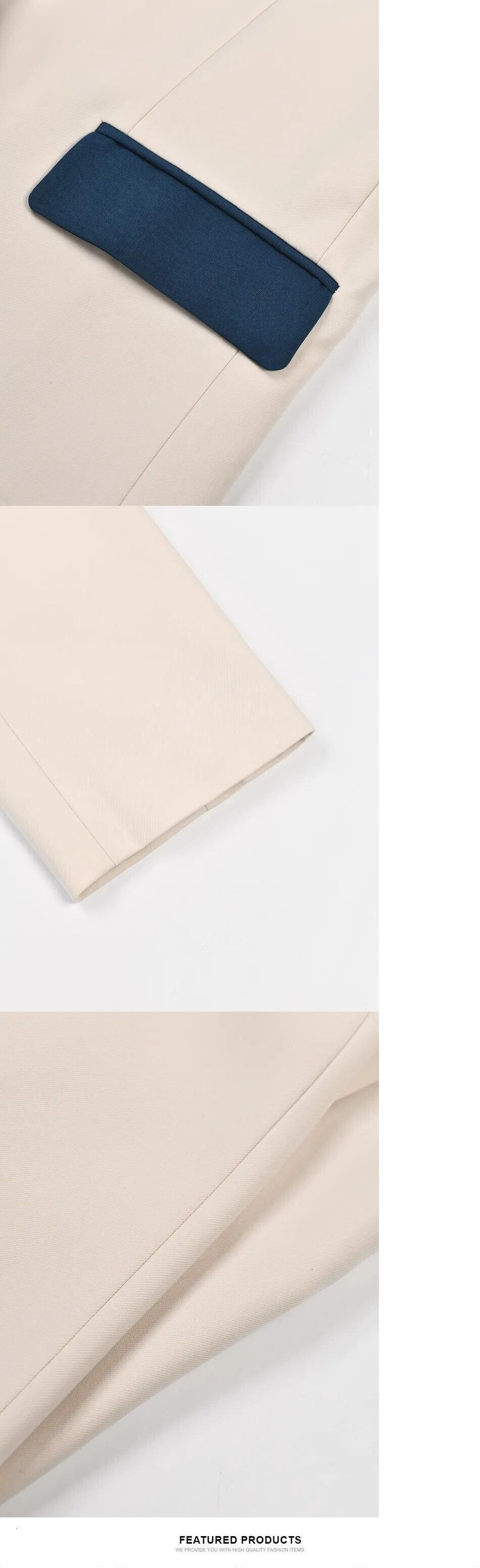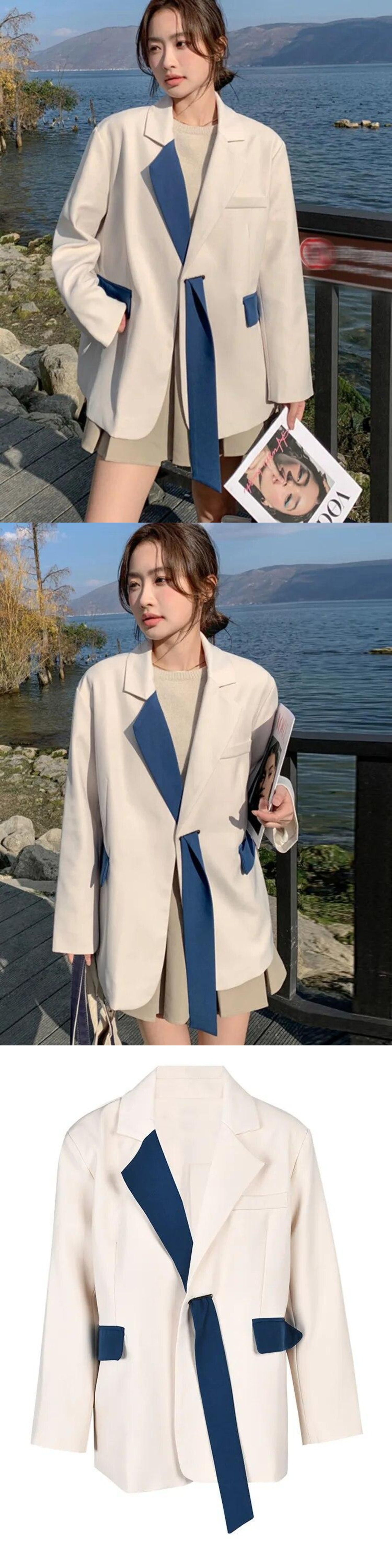 [EWQ] コントラストカラーパッチワークブレザーコート長袖包帯バックルスーツジャケット秋潮ポケットトップ ロング オータム 秋物