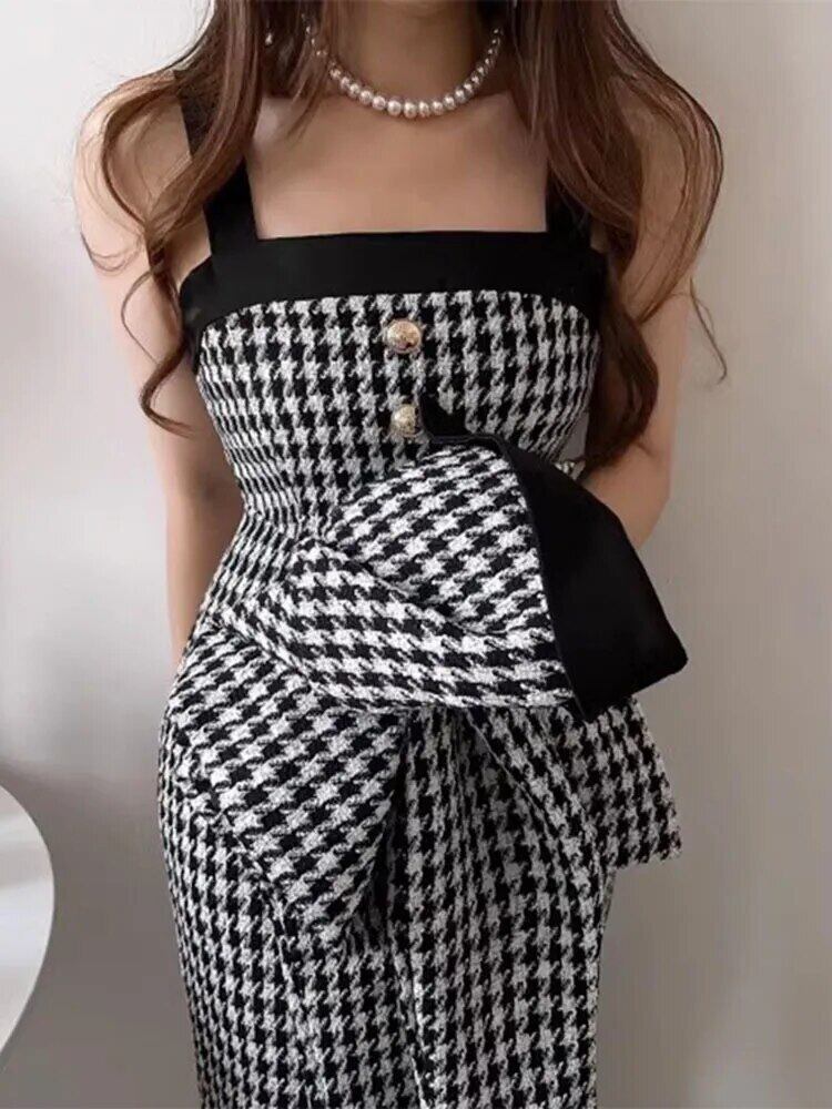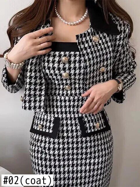 [EWQ] レトロチェック柄ドレスセット秋長袖シングルブレストショートジャケット + スリムスリングドレス 2 ピーススーツ ロング オータム 秋物