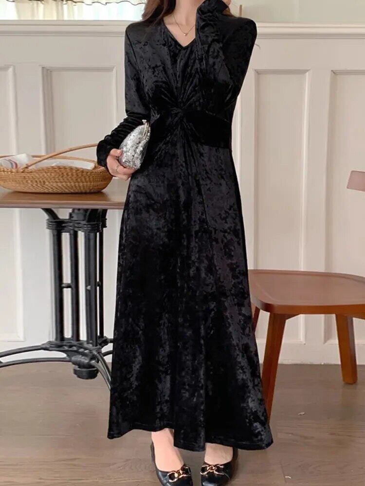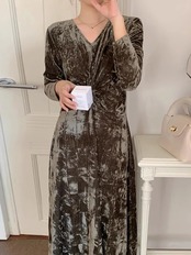 [EWQ] ベルベットパーティードレス長袖潮染めプリント V ネックドレス Vestido 秋冬 16U4881 ロング オータム 秋物 ウィンター 冬物 Vネック