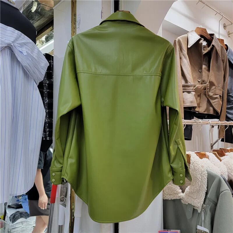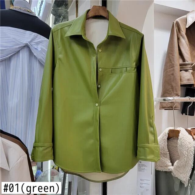 [EWQ] ブラウンレザーシャツ長袖ルーズビッグサイズシングルブレスト PU 秋冬潮ブラウス ロング オータム 秋物 ウィンター 冬物