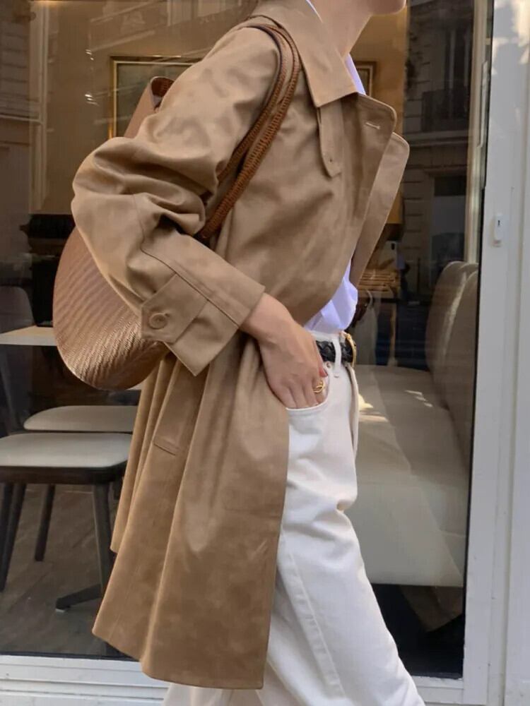 [EWQ] ディアスキンベルベットカーキトレンチジャケットシングルブレストルーズウインドブレーカー秋冬潮 16U3914 オータム 秋物 ウィンター 冬物