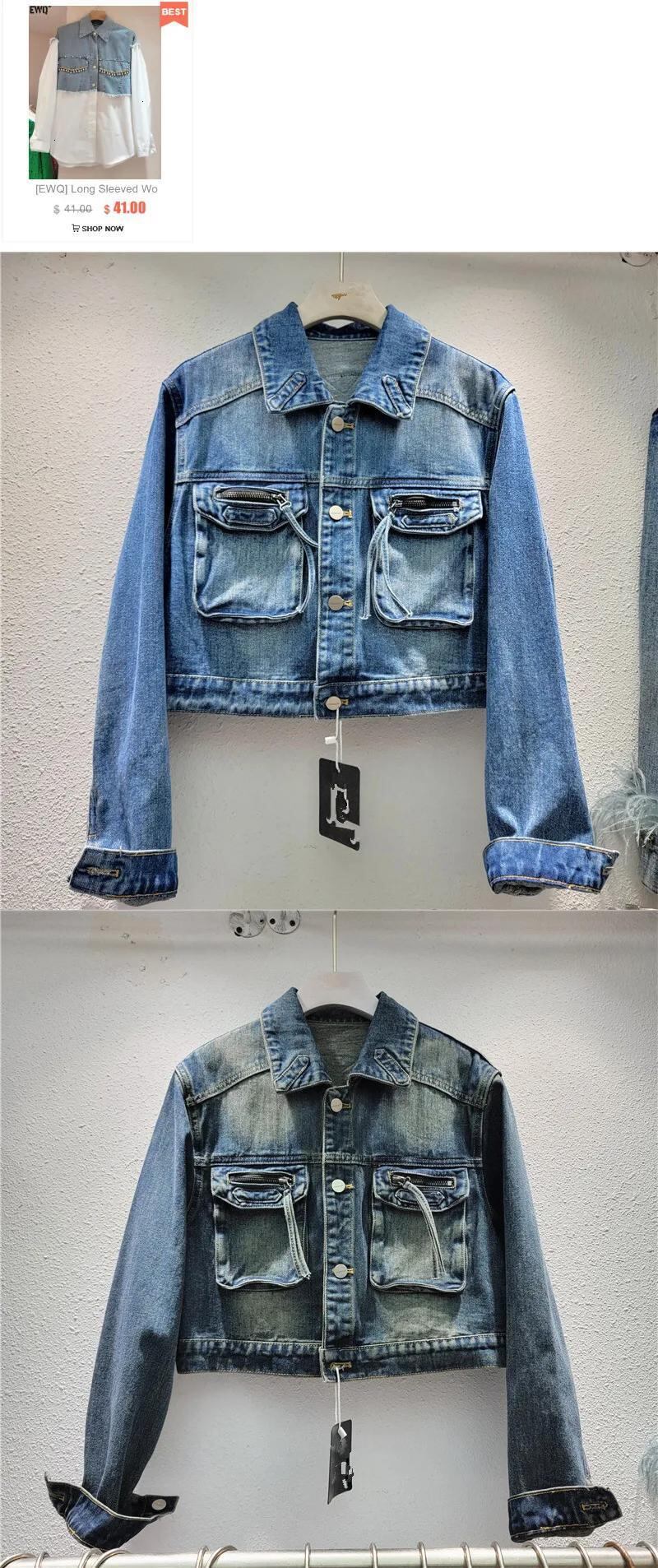 [EWQ] 長袖 デニムジャケット レディース トレンド ポケット ジッパー パッチワーク ショートジャケット コート 秋冬 16U4469 ロング オータム 秋物 ウィンター 冬物