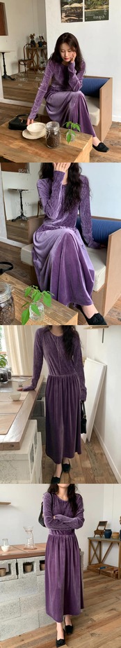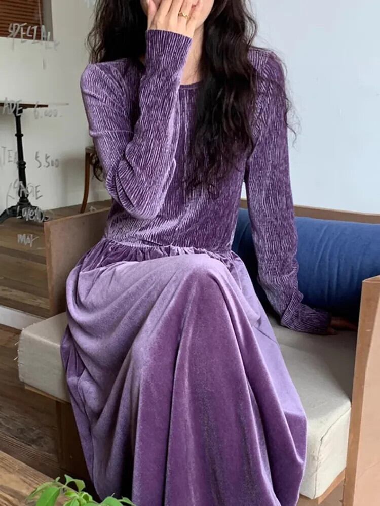 [EWQ] パープルベルベットドレスプリーツパッチワーク長袖ドレス Vestido 秋冬 16U5226 ロング オータム 秋物 ウィンター 冬物
