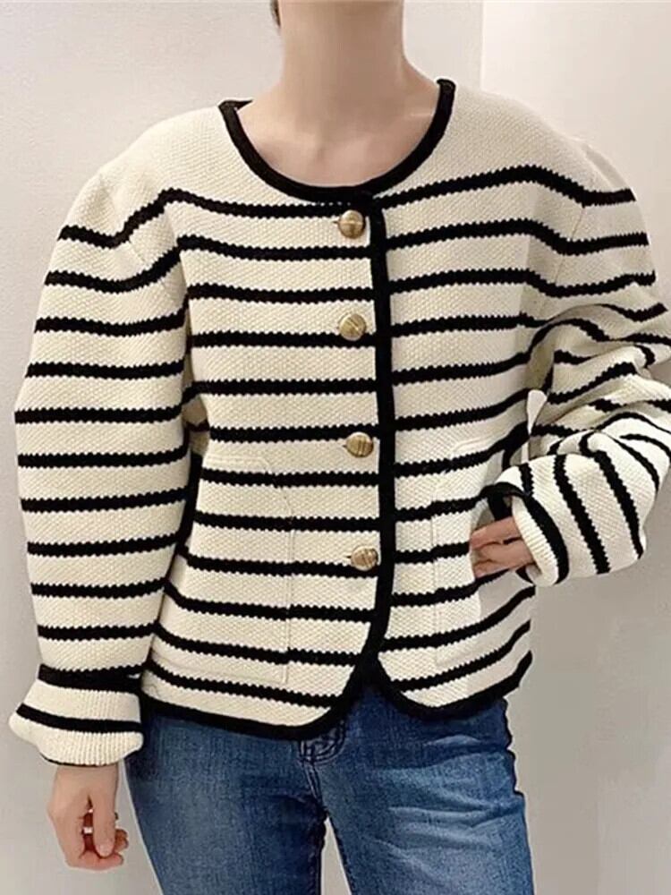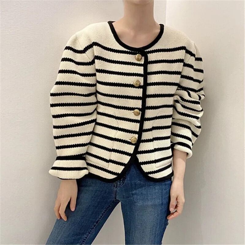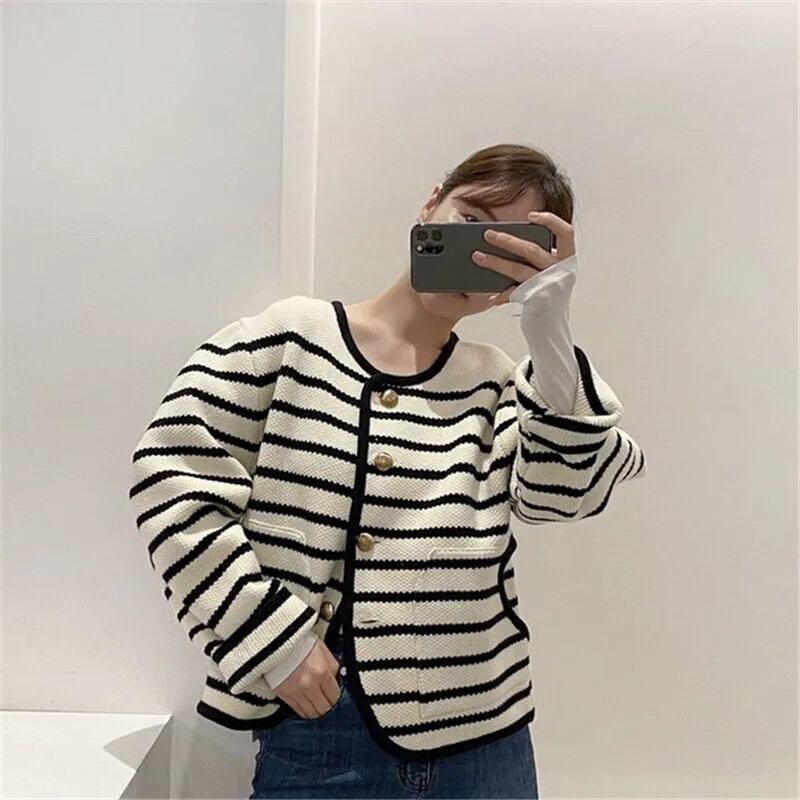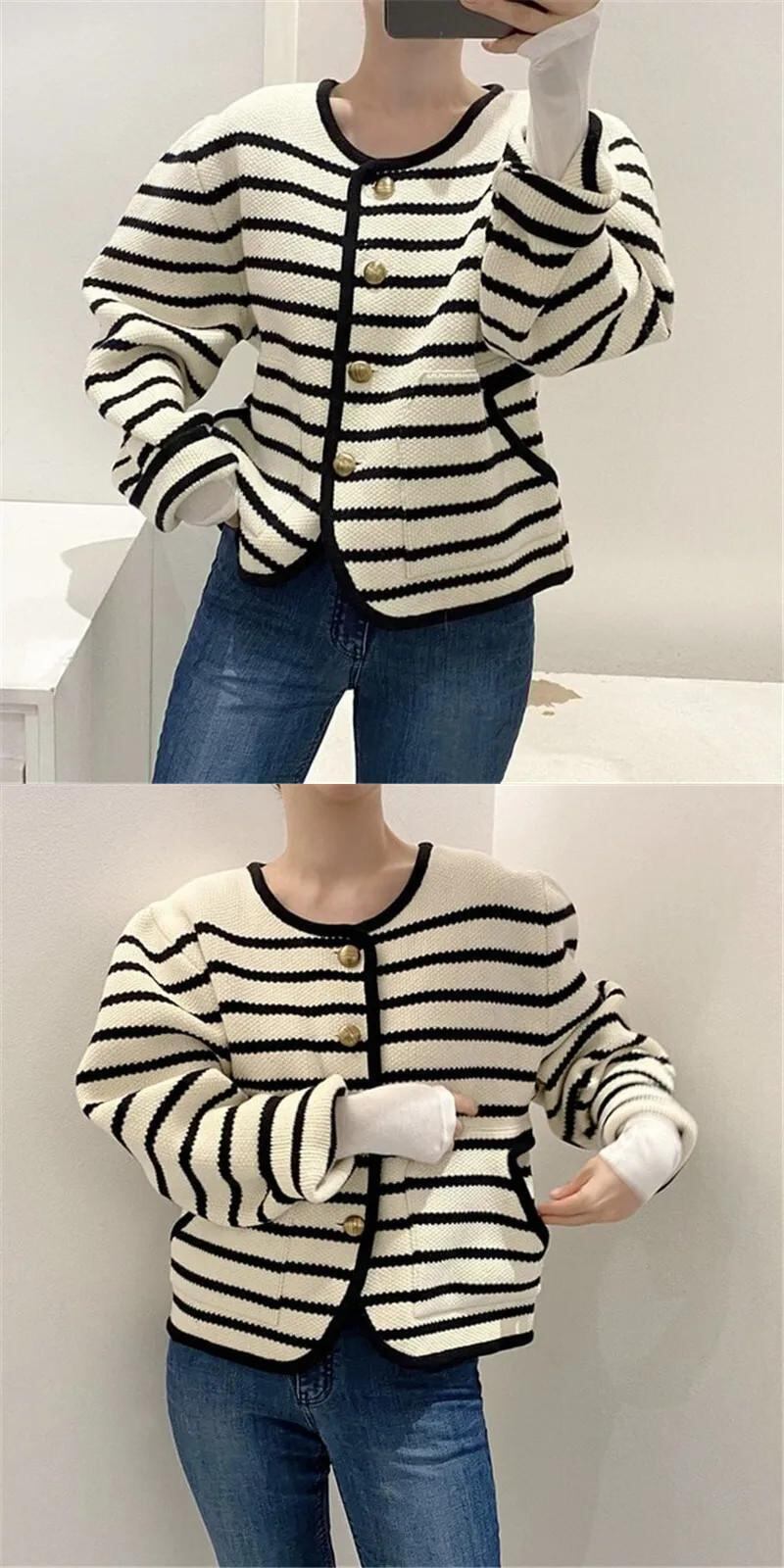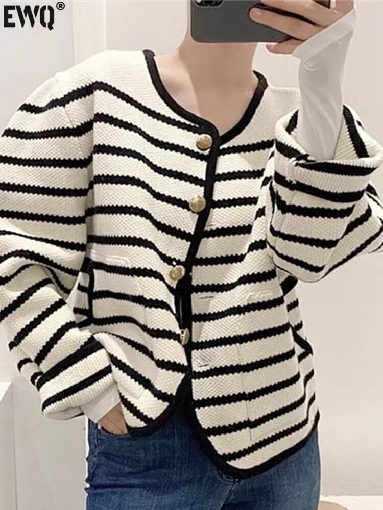 [EWQ] ルーズストライプコントラストカーディガンコート長袖シングルブレストセータージャケット秋ニットコート ロング オータム 秋物