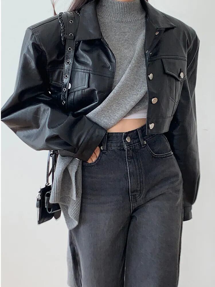[EWQ] メタルボタンポケット PU レザージャケットストリート黒長袖ジャケット秋冬 16U4079 ロング ブラック オータム 秋物 ウィンター 冬物