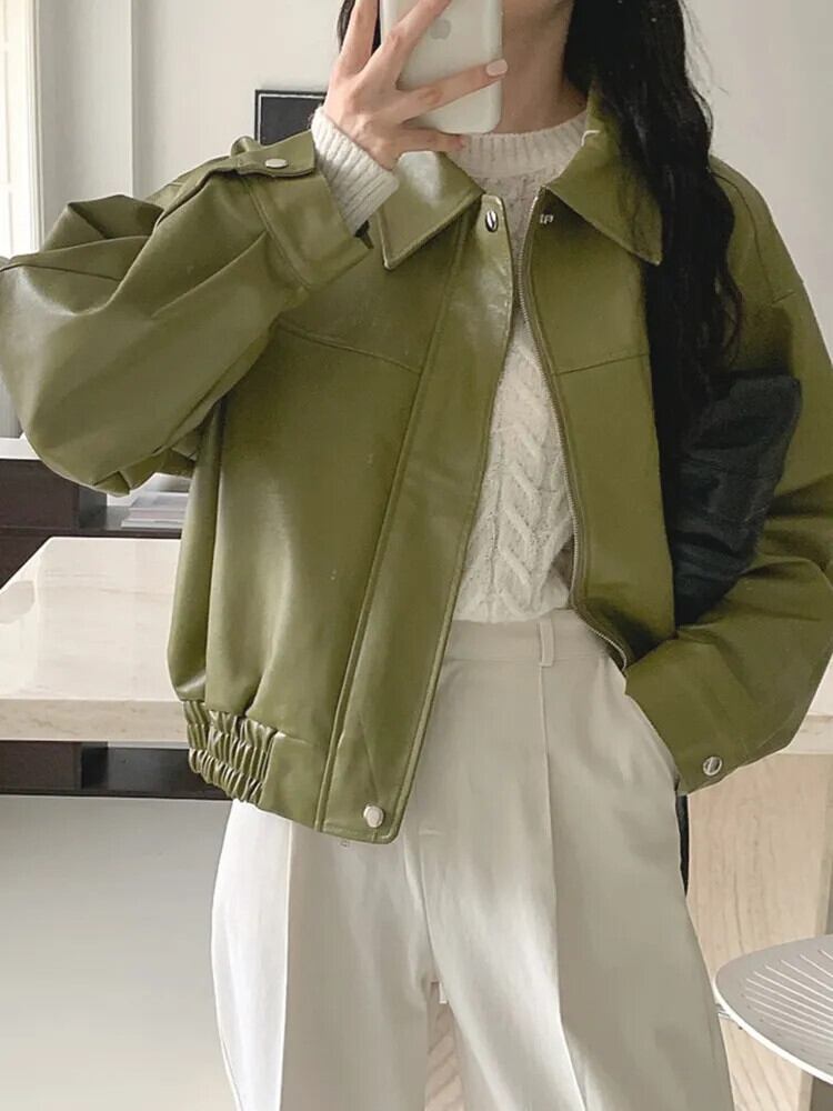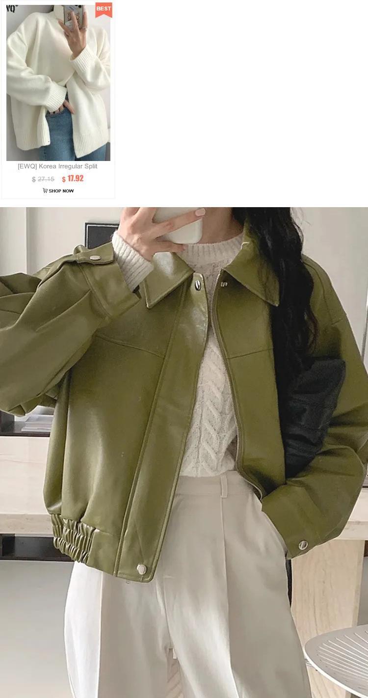 [EWQ] PU レザージャケット グリーン 長袖裾弾性ルーズ ジップ ジャケット コート 秋冬 16U4305 ロング エラスティック 伸縮 オータム 秋物 ウィンター 冬物