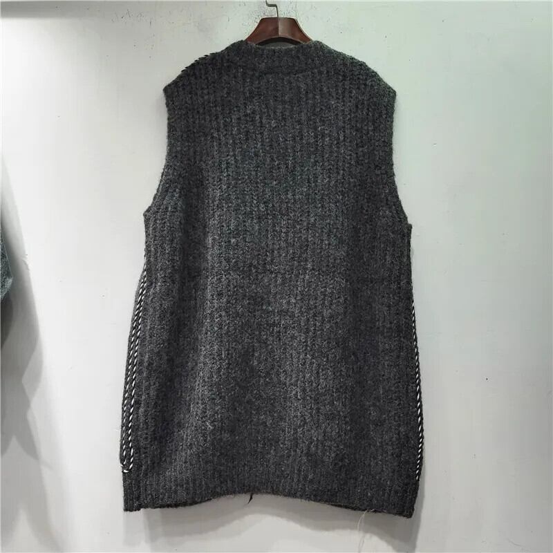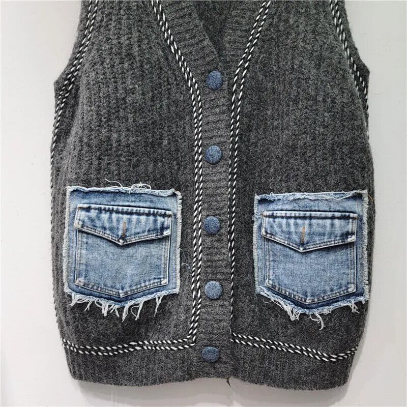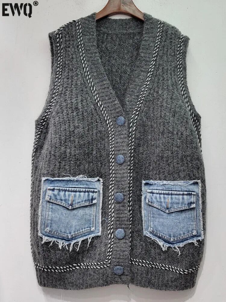 [EWQ] スプライスデニムポケット V ネックベスト多用途ニットチョッキ秋冬トップ 16U5290 オータム 秋物 ウィンター 冬物 Vネック