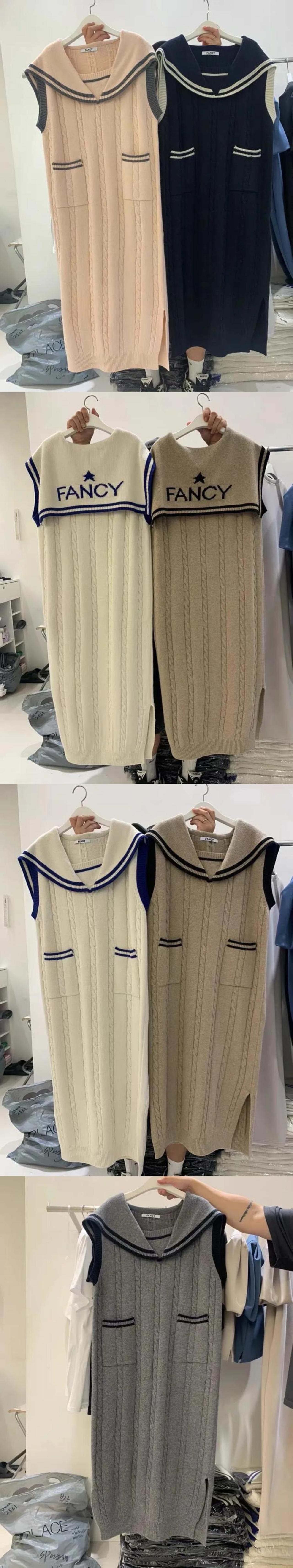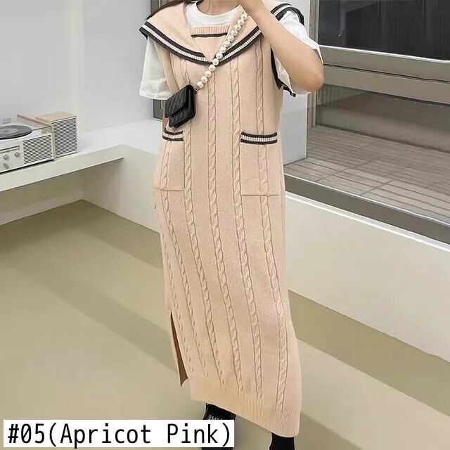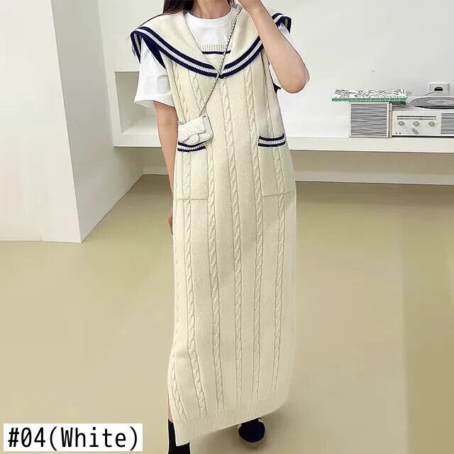 [EWQ] コントラストストライプセーラーカラーセーターベストドレスダブルポケットルーズニットドレス秋冬 16U4880 オータム 秋物 ウィンター 冬物