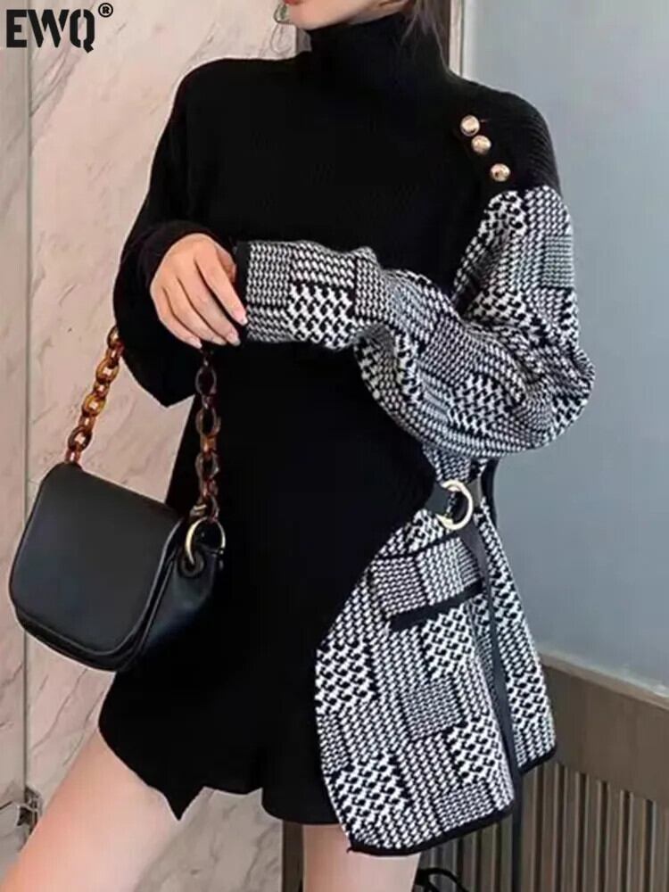[EWQ] 冬チェック柄パッチワークセーター長袖ボタン装飾レースアッププルオーバーニット秋 16U5430 ロング オータム 秋物 ウィンター 冬物