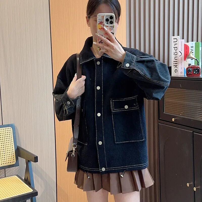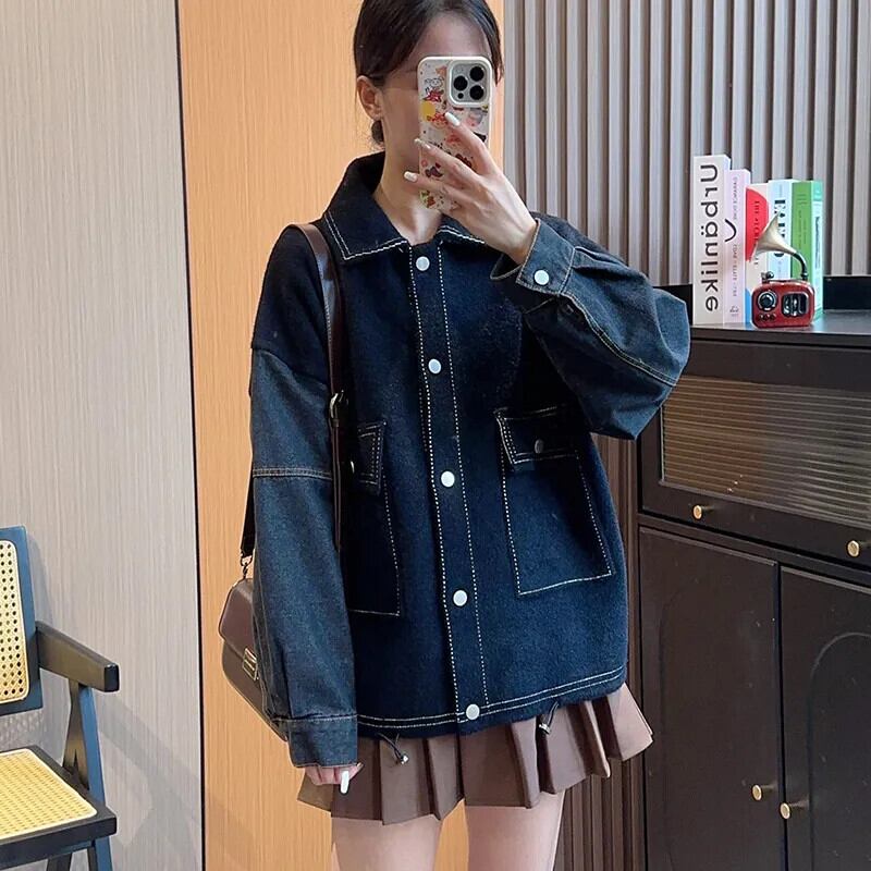 [EWQ] 美 長袖 デニム パッチワーク ニット カーディガン ゆったり アウター コーヒーコート ジャケット 秋冬 ロング オータム 秋物 ウィンター 冬物