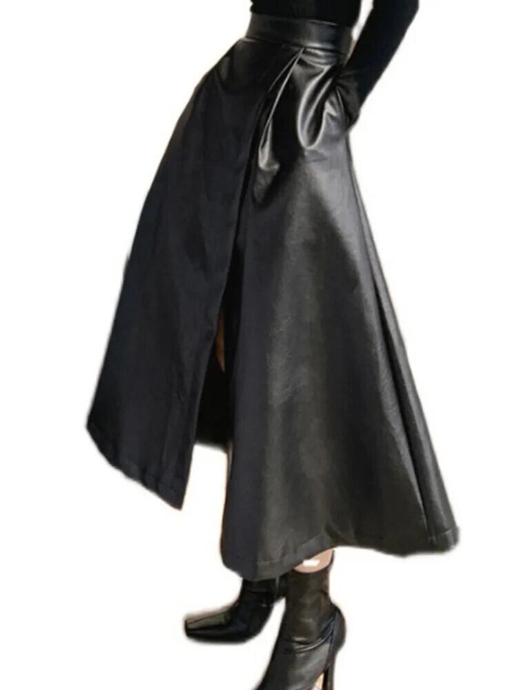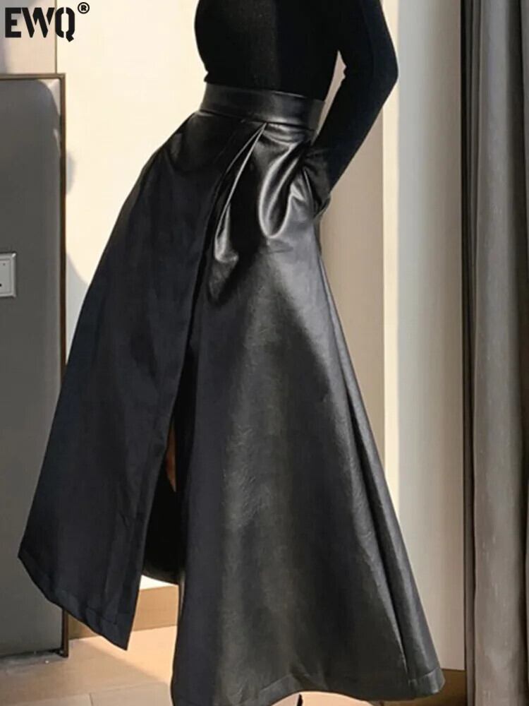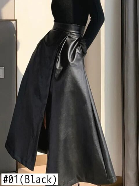 [EWQ] 黒 PU レザースカートウエストスリムスプリット A ラインスカート秋冬 16U5197 ブラック オータム 秋物 ウィンター 冬物 Aライン