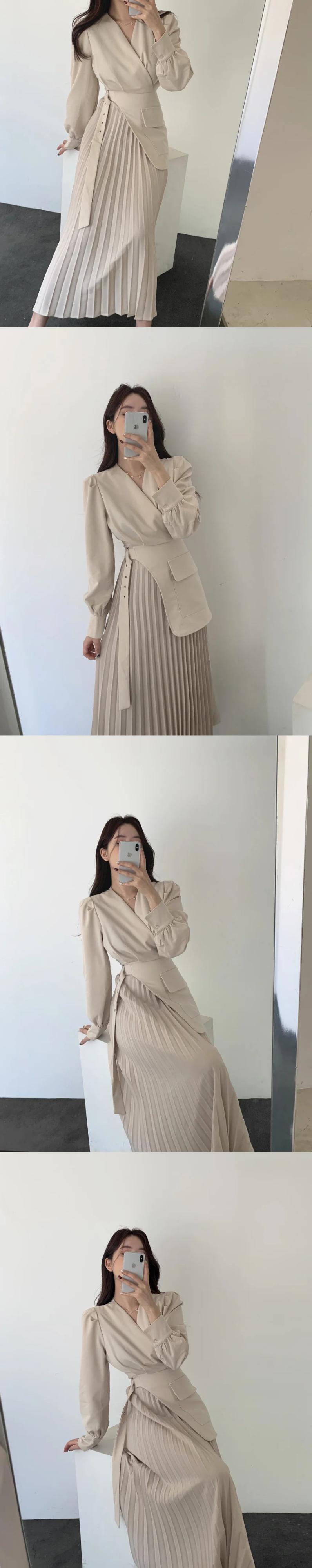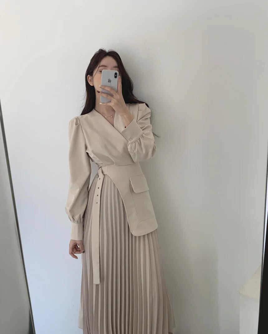 [EWQ] V ネック長袖ミニマリストパッチワークプリーツ裾スーツドレスベルト付きモダンレディブレザードレス秋 8Q821 ロング オータム 秋物 ハーネス Vネック