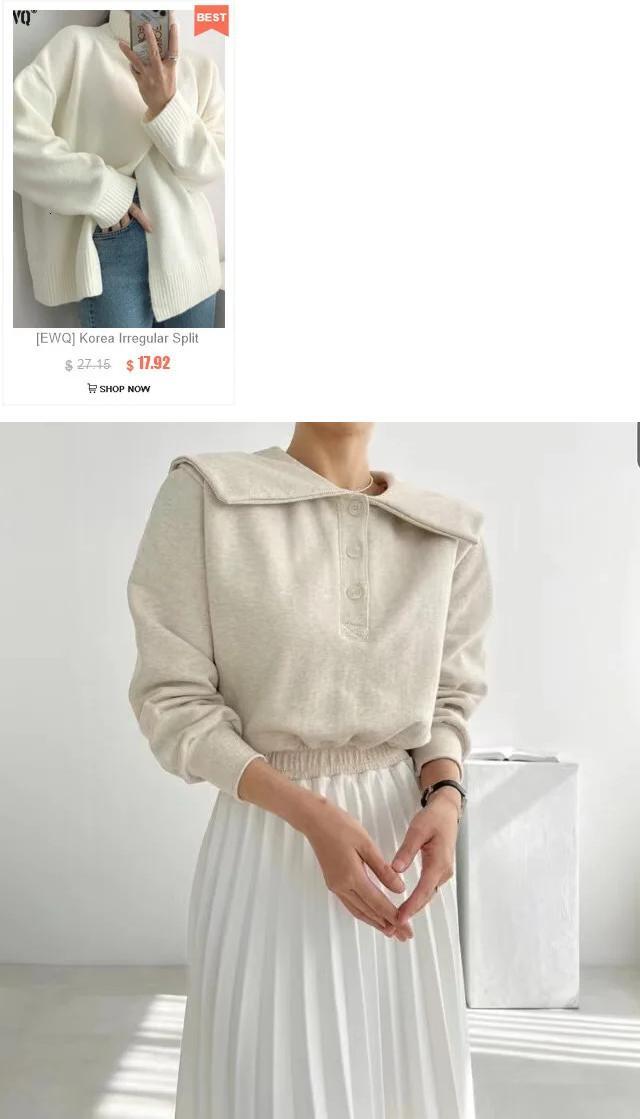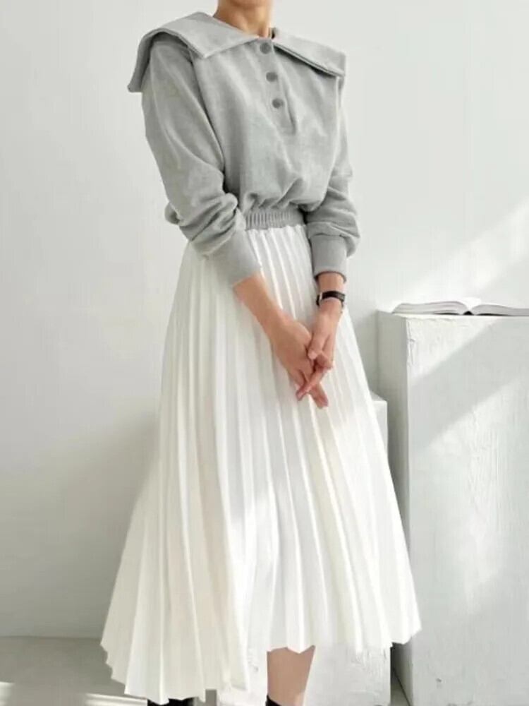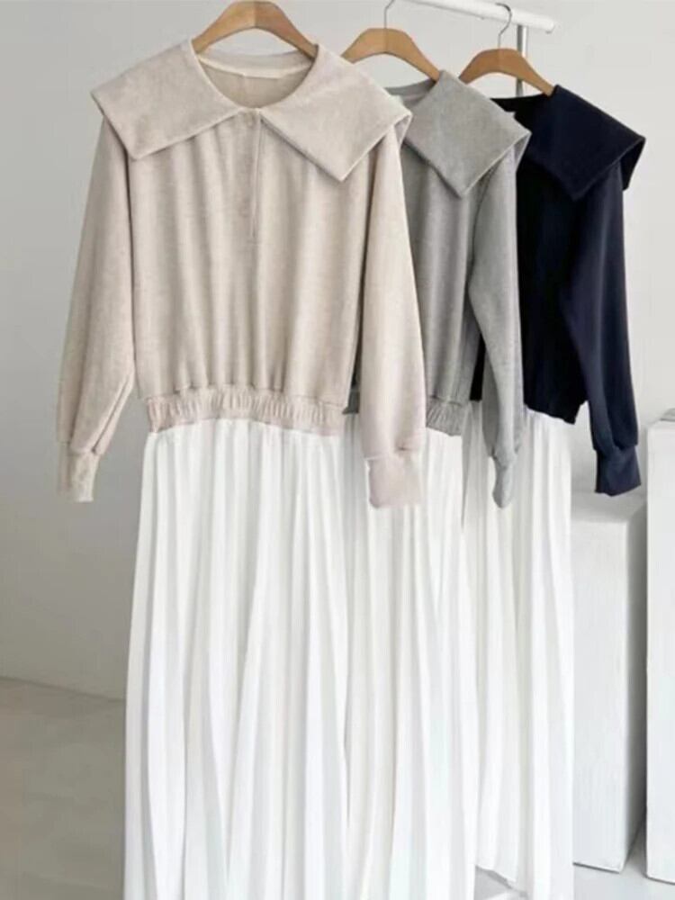 [EWQ] スウェットシャツスプライシングコントラストドレス長袖弾性ウエストプリーツドレス Vestido 秋冬 16U5150 ロング エラスティック 伸縮 オータム 秋物 ウィンター 冬物