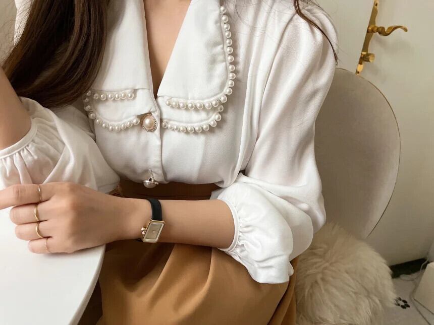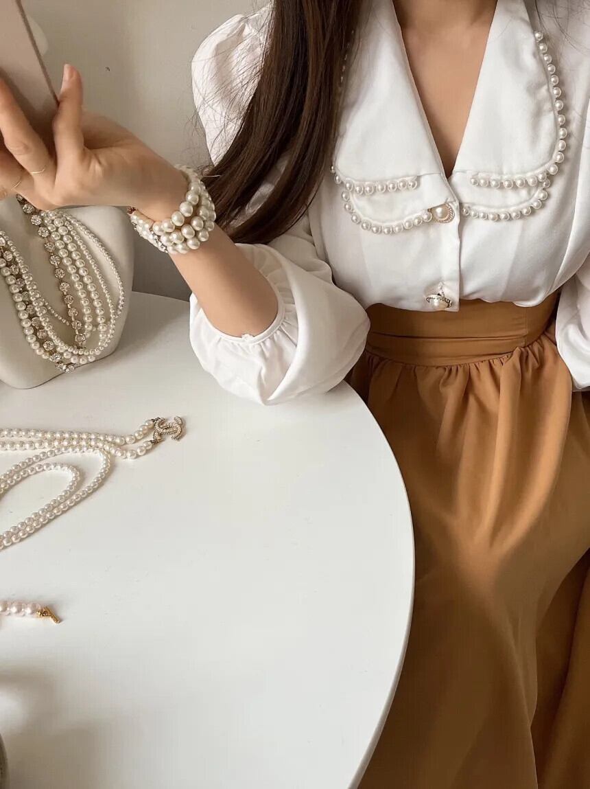 [EWQ] レディース シャツ ダブルラペル パール装飾 ランタン スリーブ オータム タイド トップ 2581 ランタンスリーブ 秋物 真珠
