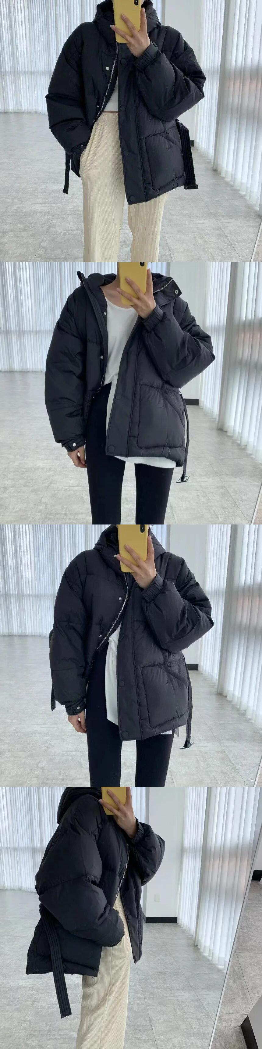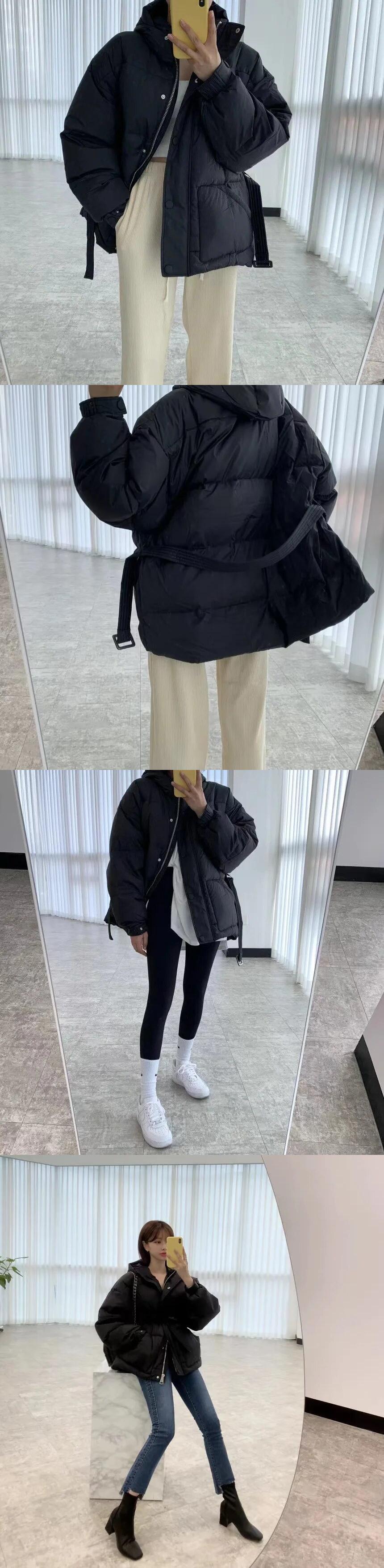 [EWQ] 黒フード付き綿パッド入りコートシングルブレストレースアップ肥厚アウター秋冬 16U5390 ブラック コットン オータム 秋物 ウィンター 冬物