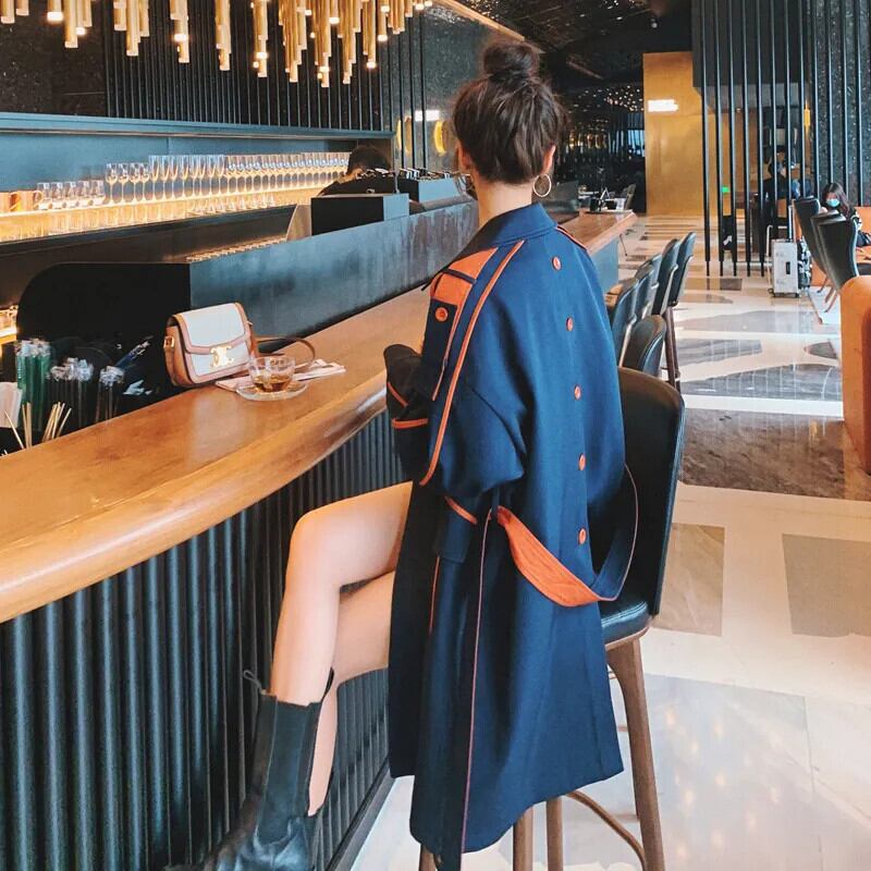 [EWQ] ターンダウンカラー ダブルブレスト パッチワークパネル ネビーブルー レースアップ オーバーニー ウインドブレーカー オーバーコート 秋 8P087 オータム 秋物