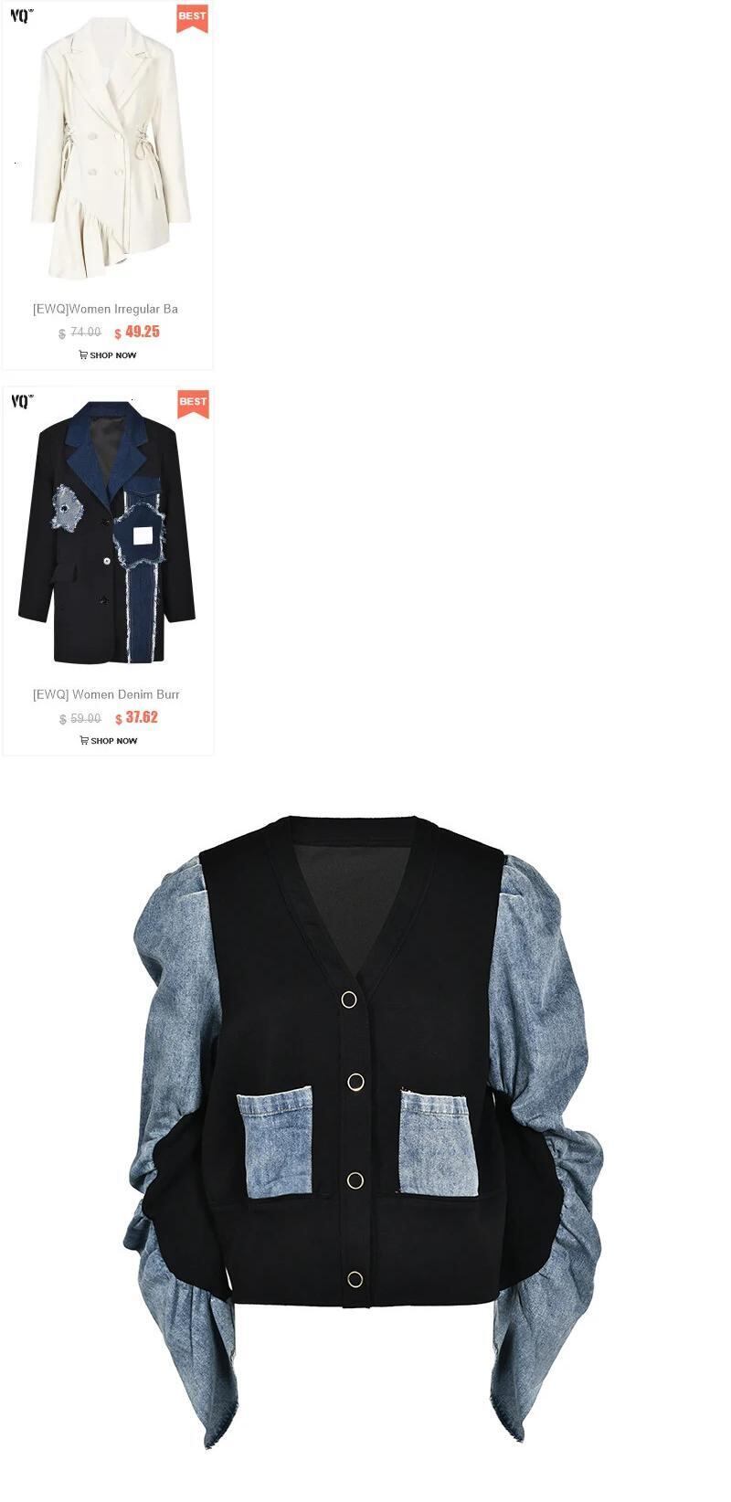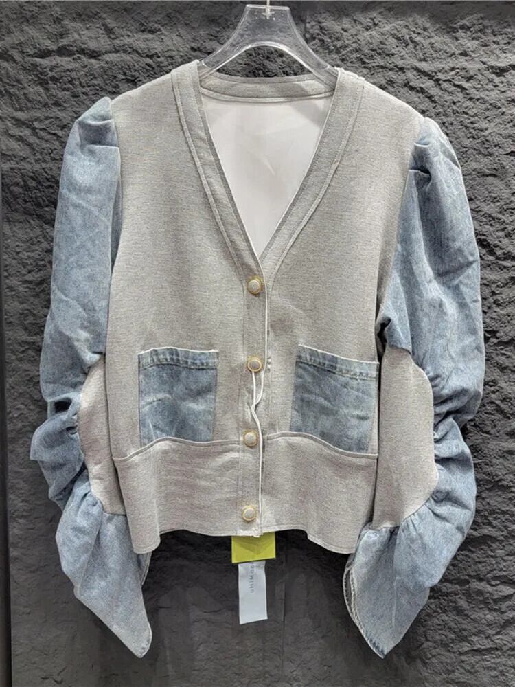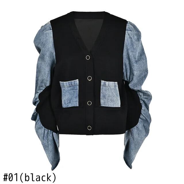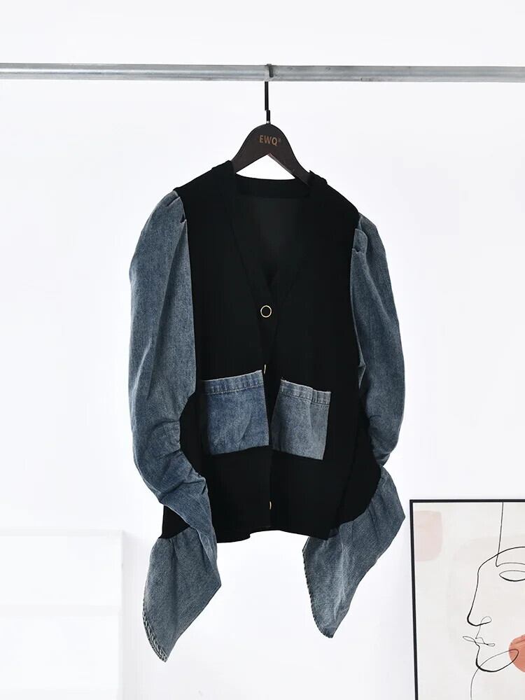 [EWQ] カーブプリーツ袖パッチワークデニム V ネックトップス長袖レディースニット黒セータージャケットルーズ秋 U34 ロング ブラック オータム 秋物 Vネック