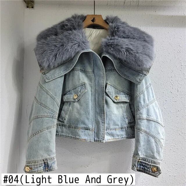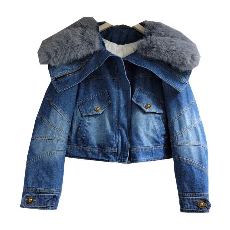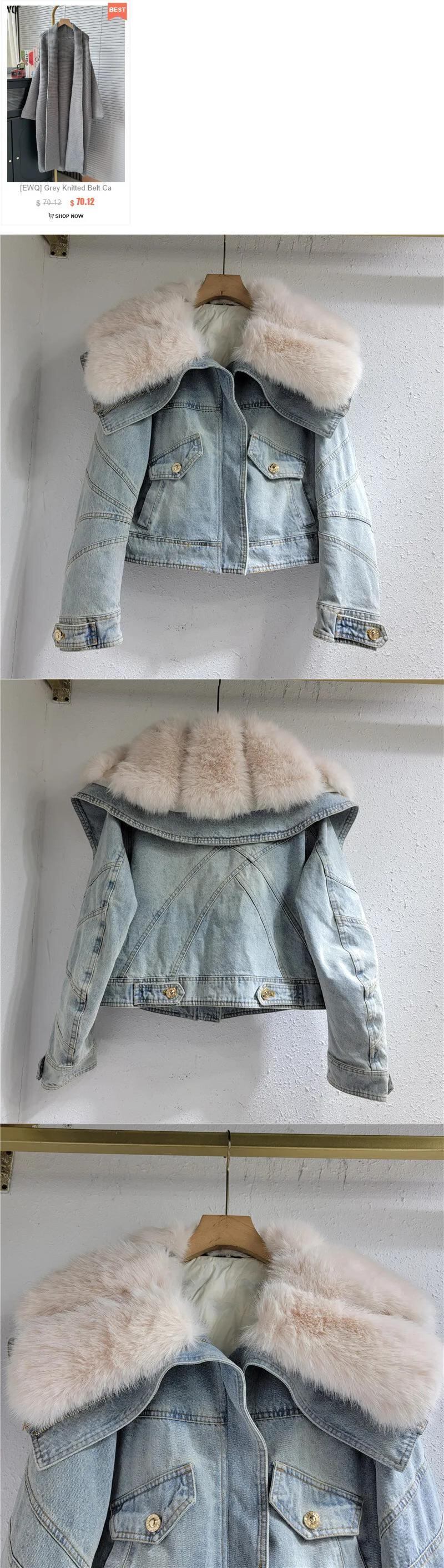 [EWQ] フェイクファーネックデニムコート長袖ブルーパッチワーク生き抜く暖かジャケット秋冬 6U5546 ロング オータム 秋物 ウィンター 冬物