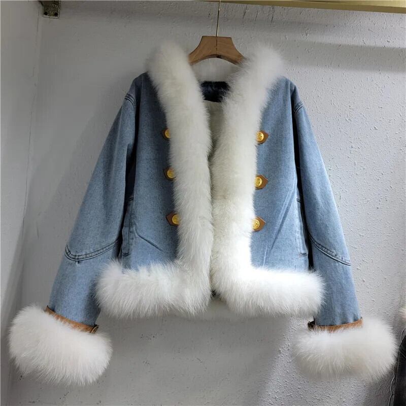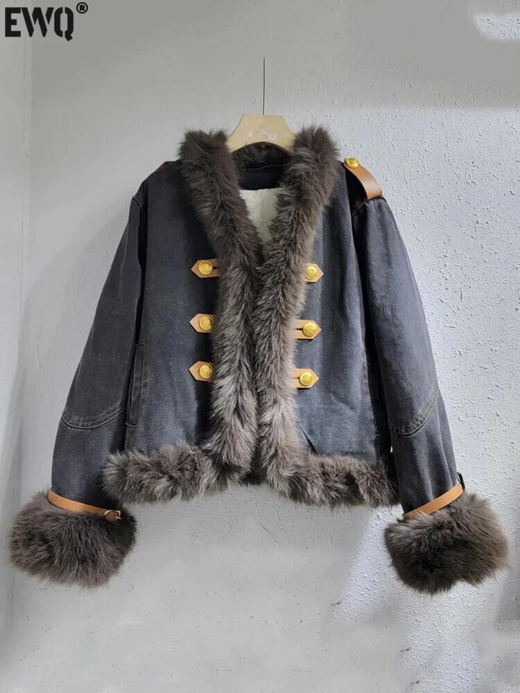 [EWQ] シックシングルブレストストリートデニムジャケット長袖フェイクファーパッチワーク暖かコート秋冬 16U5515 ロング オータム 秋物 ウィンター 冬物